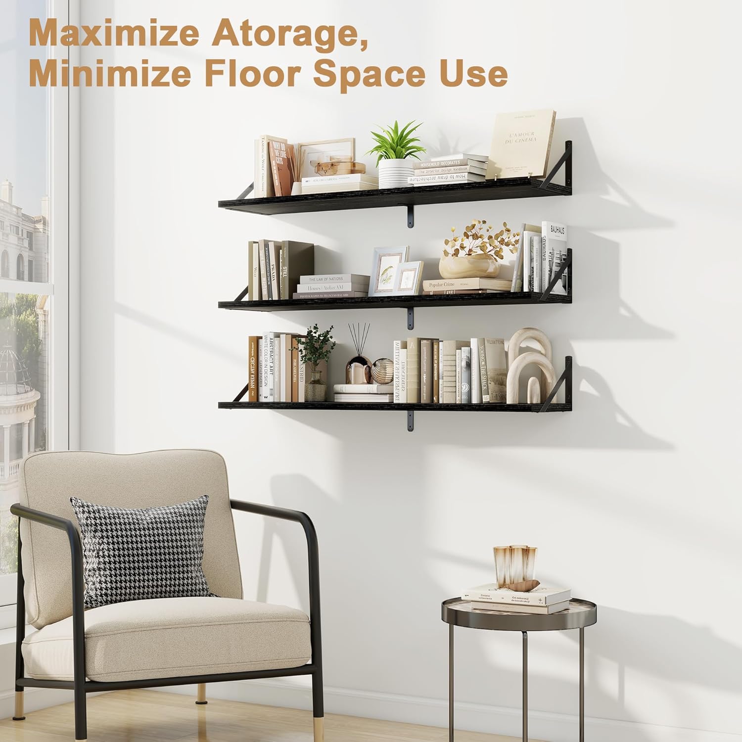 Fun Memories Long Wall Shelves for Bedroom, Set of 3 Large 40-Inch Floating Bookshelves, Rustic Wood Display Shelf for Home and Office (Black)