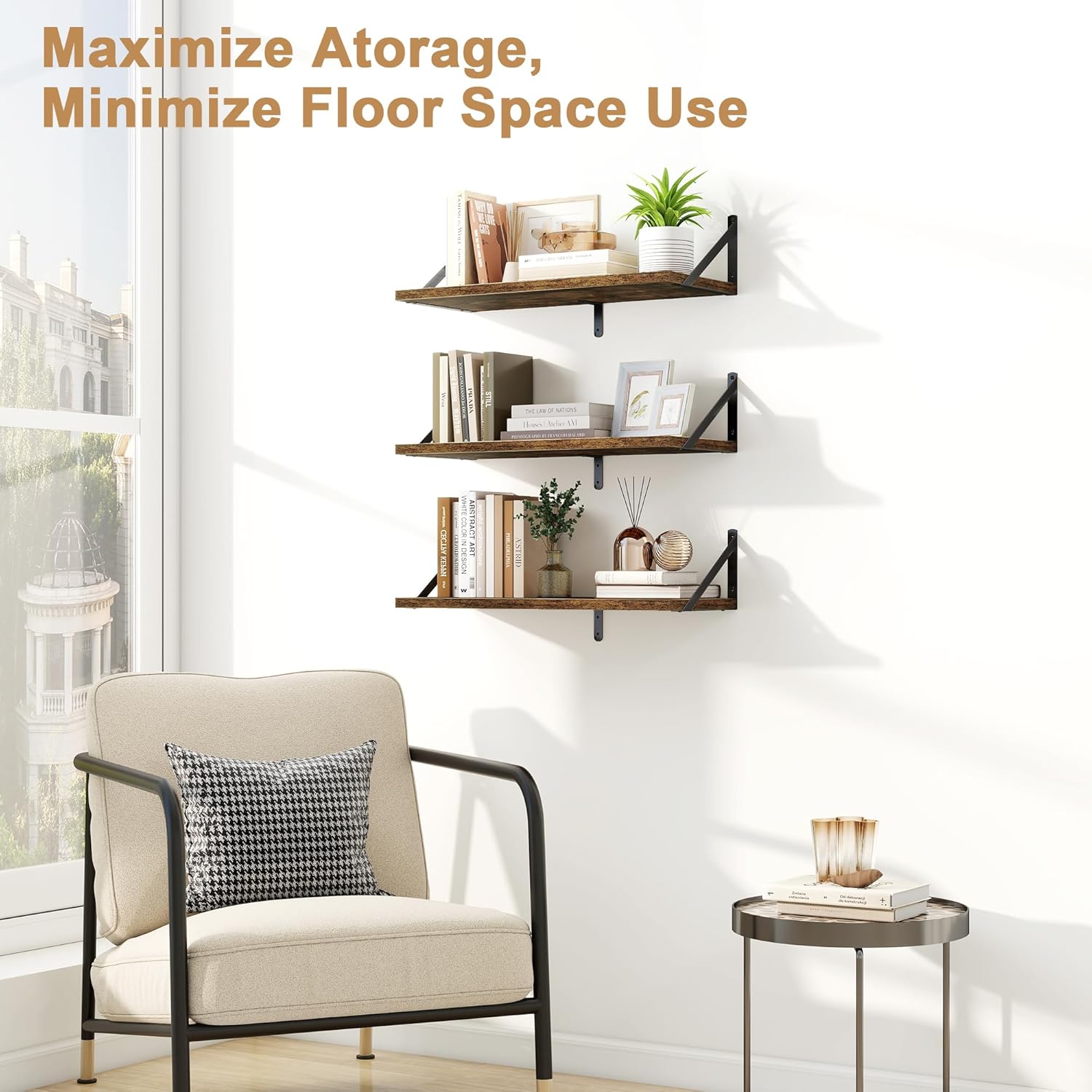 Fun Memories Floating Bookshelves, Set of 3 Wall-Mounted Wood Shelves 24" W x 8" D, Decorative Wall Shelf for Living Room, Bedroom, Bathroom, and Laundry Room (Rustic Brown)