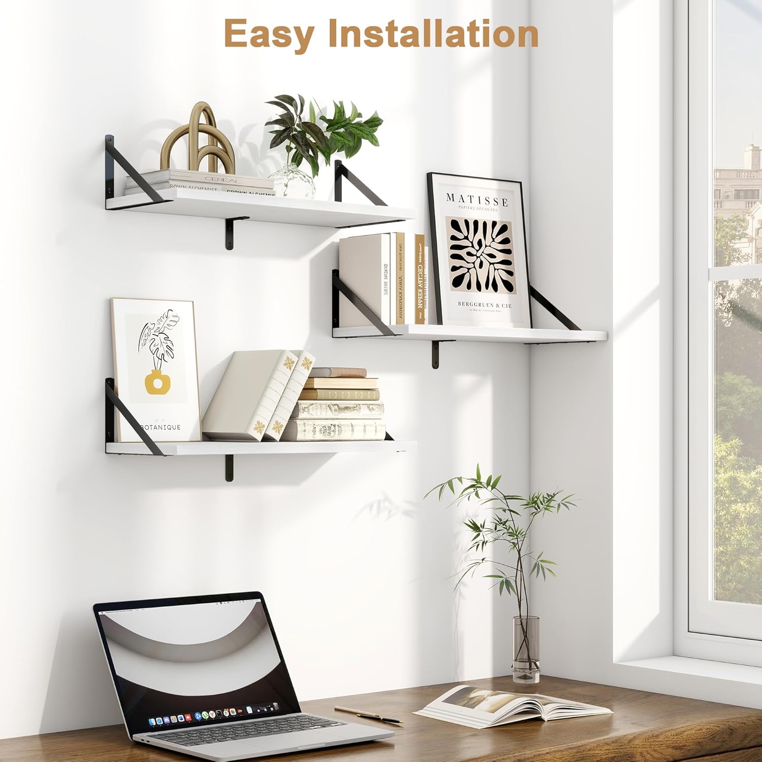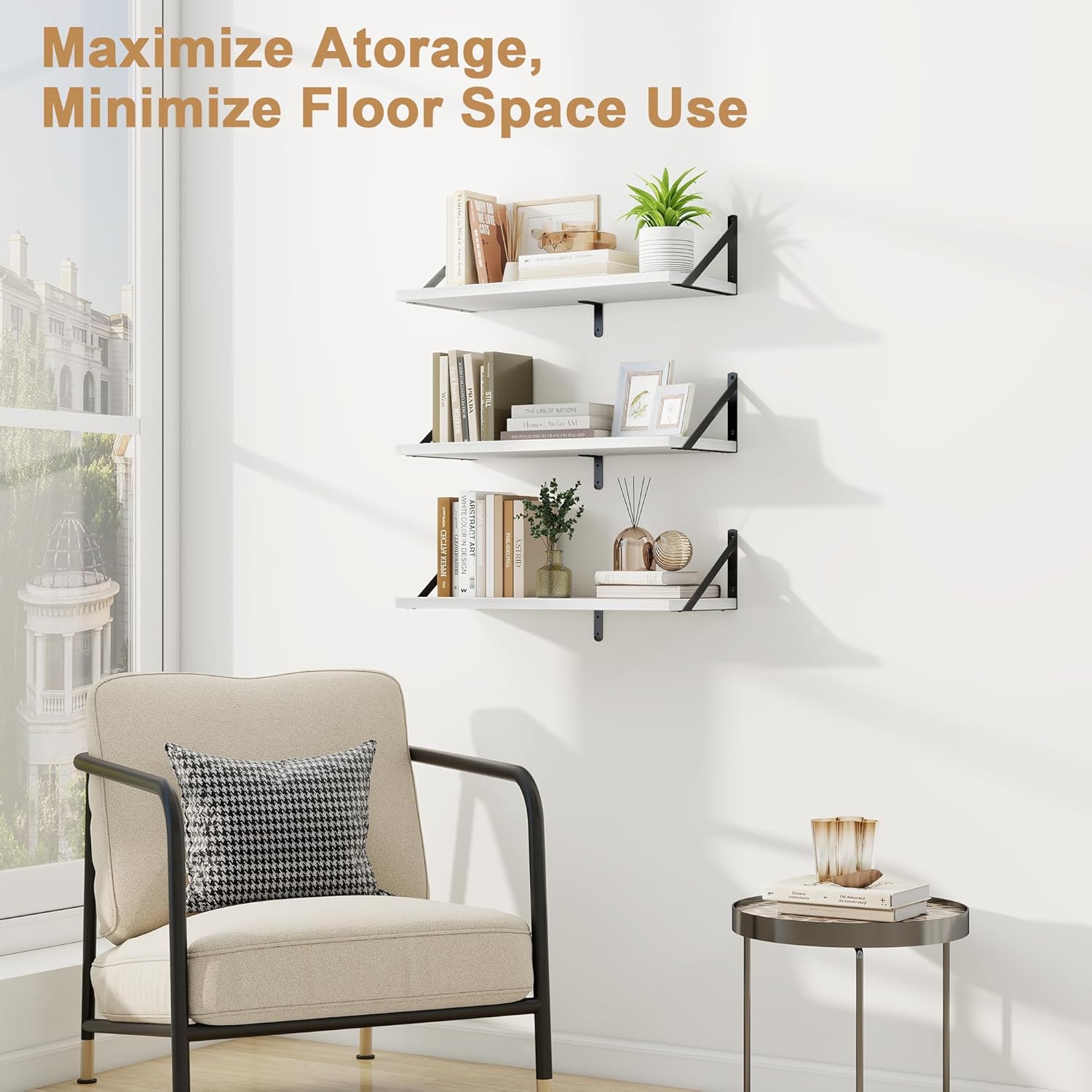 Fun Memories Floating Bookshelves, Set of 3 Wall-Mounted Wood Shelves 24" W x 8" D, Decorative Wall Shelf for Living Room, Bedroom, Bathroom, and Laundry Room (White)