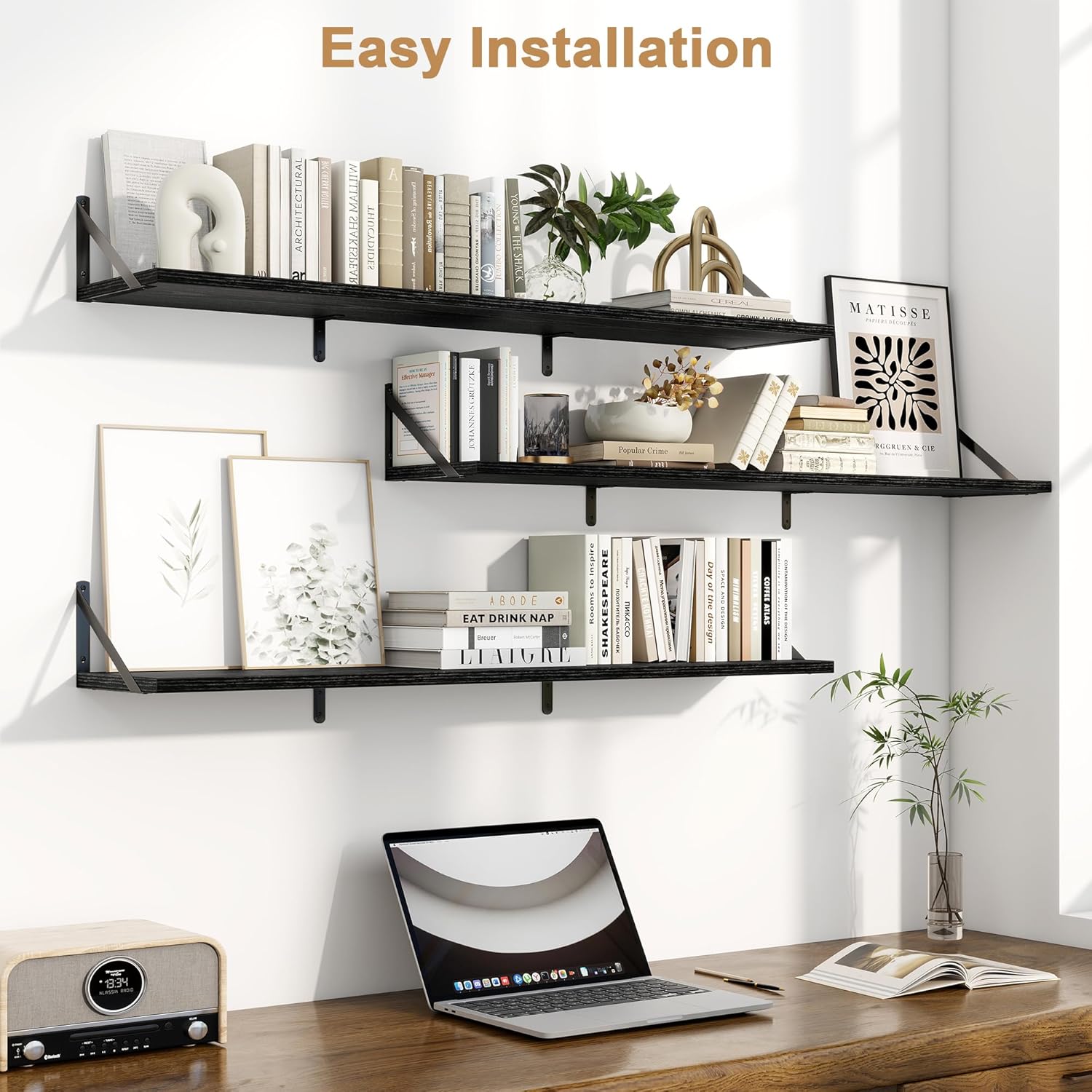Fun Memories Extra Long Floating Wall Shelves, 48 x 8 Inches, Set of 3 Large Wood Floating Bookshelves with Metal Brackets for Storage & Display (Black)