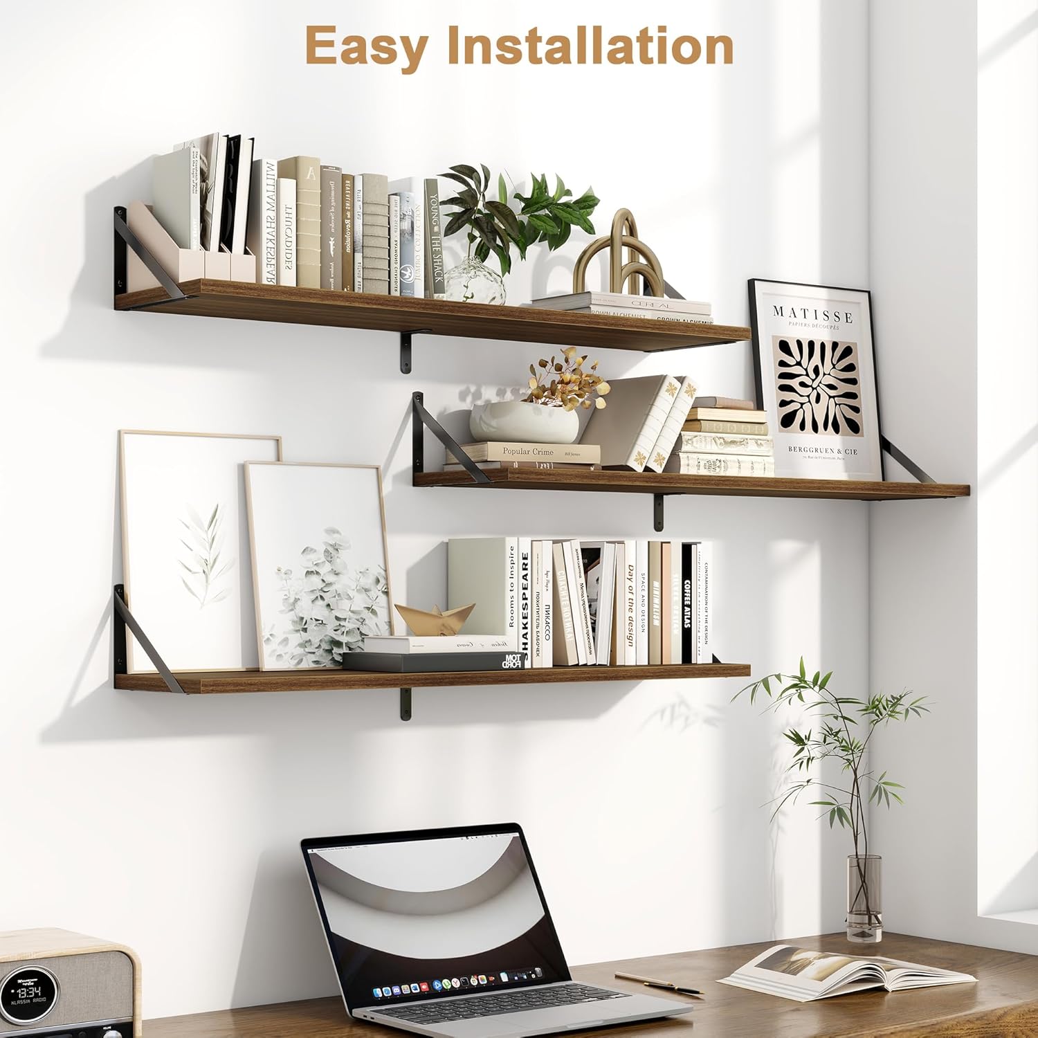 Fun Memories Long Wall Shelves for Bedroom, Set of 3 Large 40-Inch Floating Bookshelves, Rustic Wood Display Shelf for Home and Office (Walnut)