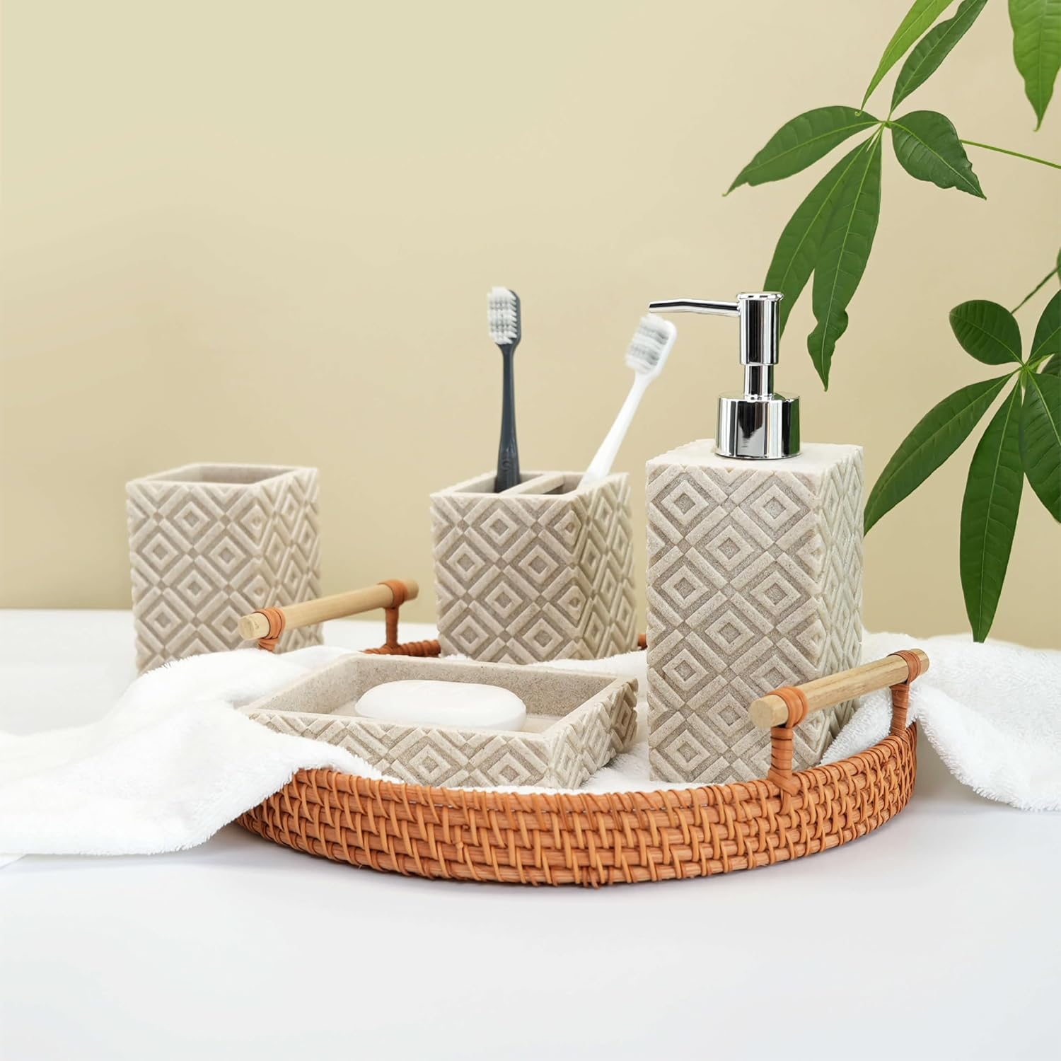 - Modern & Elegant Design: Featuring a unique natural stone look with a raised diamond pattern, this beige bathroom set adds a tactile and visually striking modern touch to any vanity or countertop.
