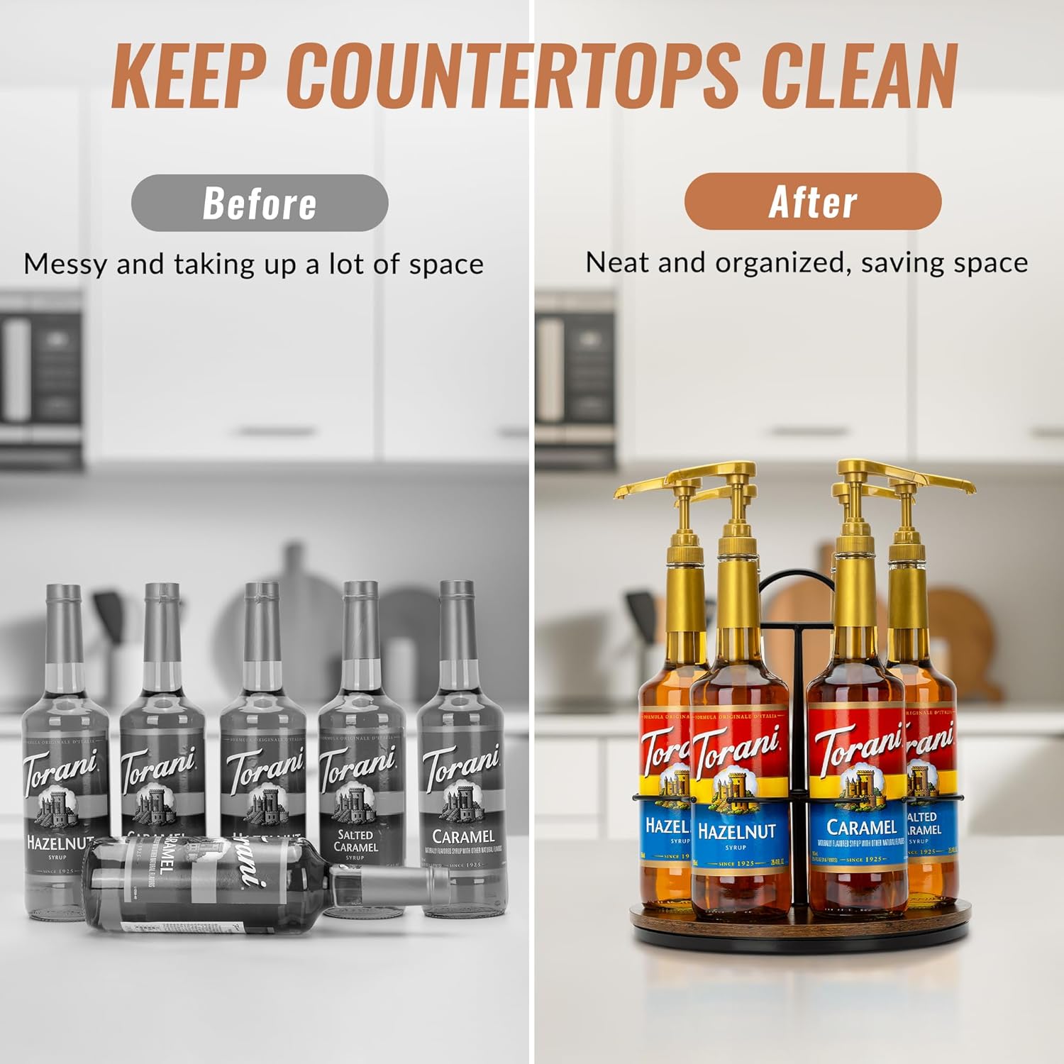- 360-Degree Rotating Base: Equipped with a rotatable base, you can easily access your coffee syrup from any angle. Non-slip pads on the bottom provide stability, allowing you to rotate the base without worry of tipping over