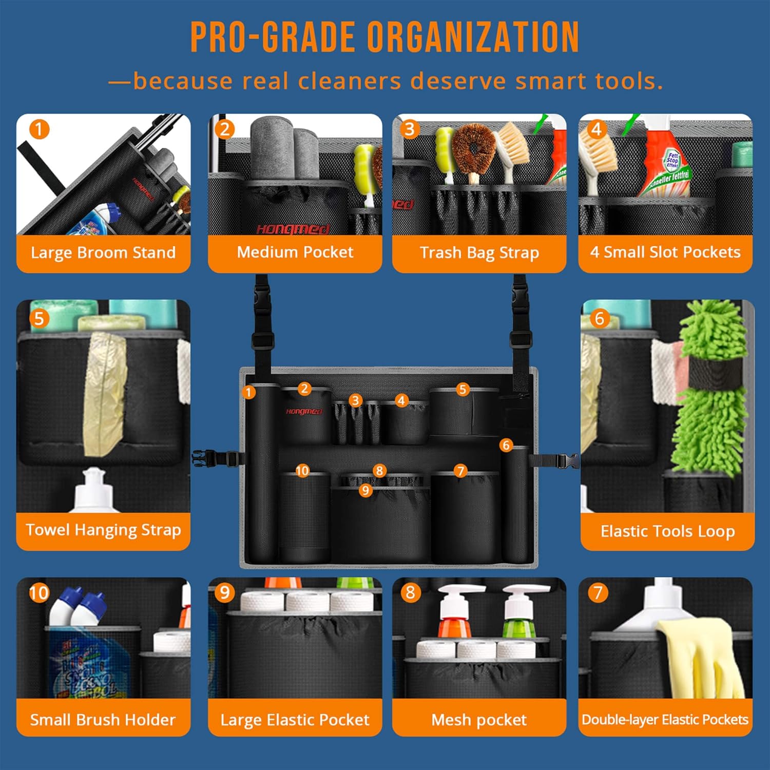 - ✨【Housekeeping Caddy Bag with 13-Pocket Pro Organizer】Holds spray bottles, scrub brushes, gloves, trash bags, and more in dedicated slots. Easy-grab design keeps supplies visible and accessible while you move.