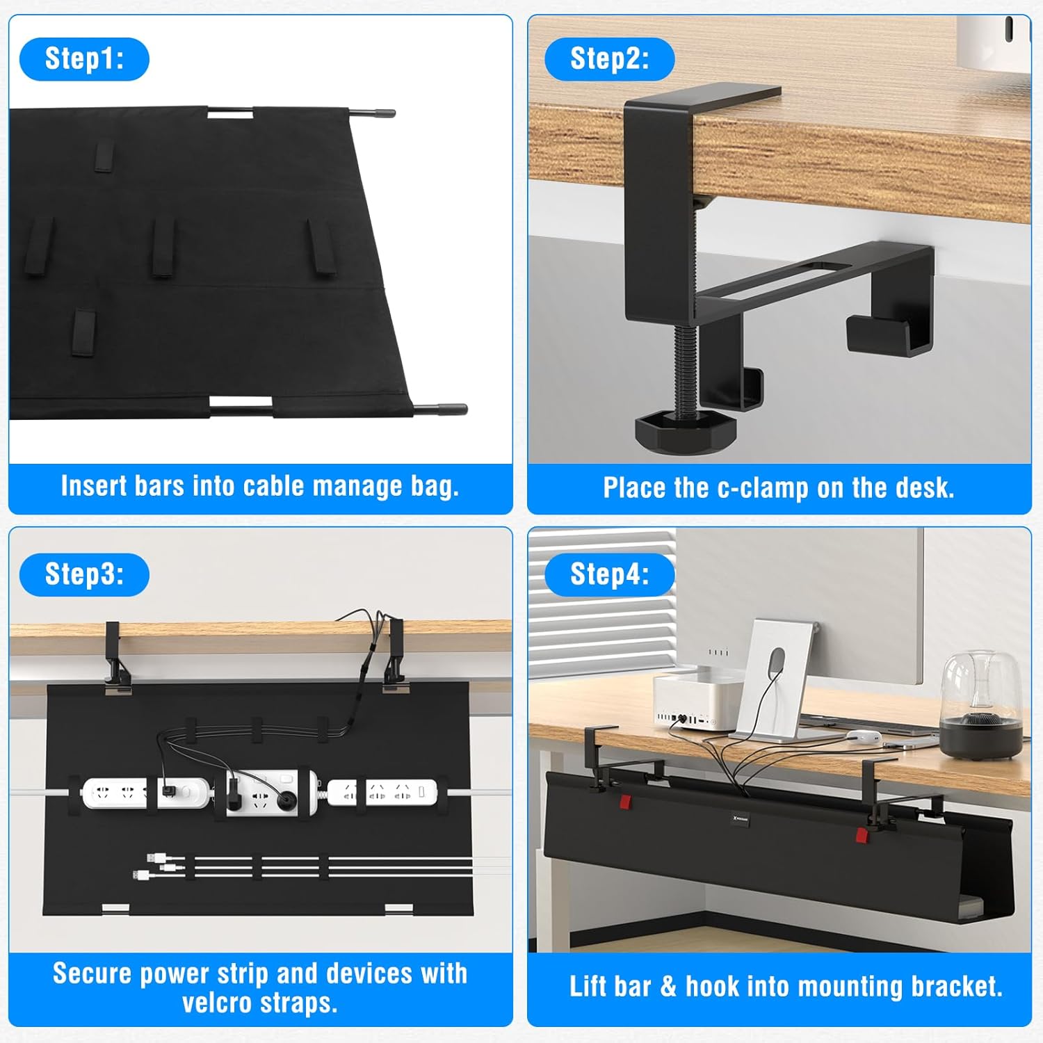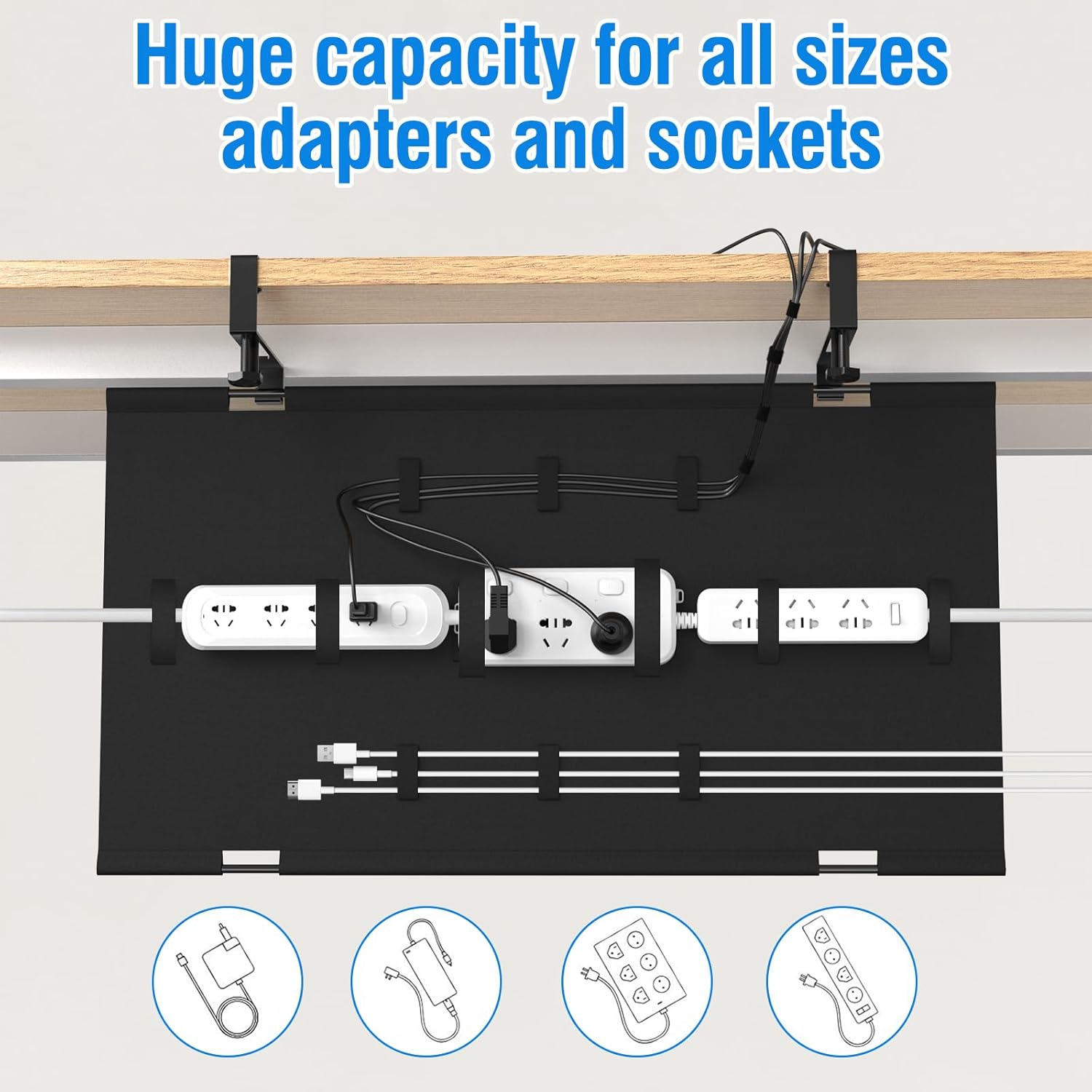 - 【Premium Quality Material】Under the desk cable management is made of high-quality 600D Oxford cloth can be flame retardant, with dustproof function, the bottom of the tray is supported to withstand heavy objects and keep the shape. Iron clips are reinforced with lifting strips to suspend greater weight. The support bar is designed with thickening, which is more sturdy and durable.
