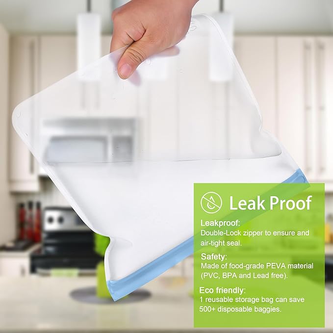 - Freezer Safe & Easy to Clean: The freezer bags can lock out freezer burn while keeping food fresh and full of taste, perfect for freezing meat, chicken, fish, fruits and vegetable. Upgraded Peva material that is dishwasher safe under 60℃/140℉. Put on the top rack of the dishwasher, while skipping high-temperature functions to extend the lifespan of the bags. Not microwave friendly.