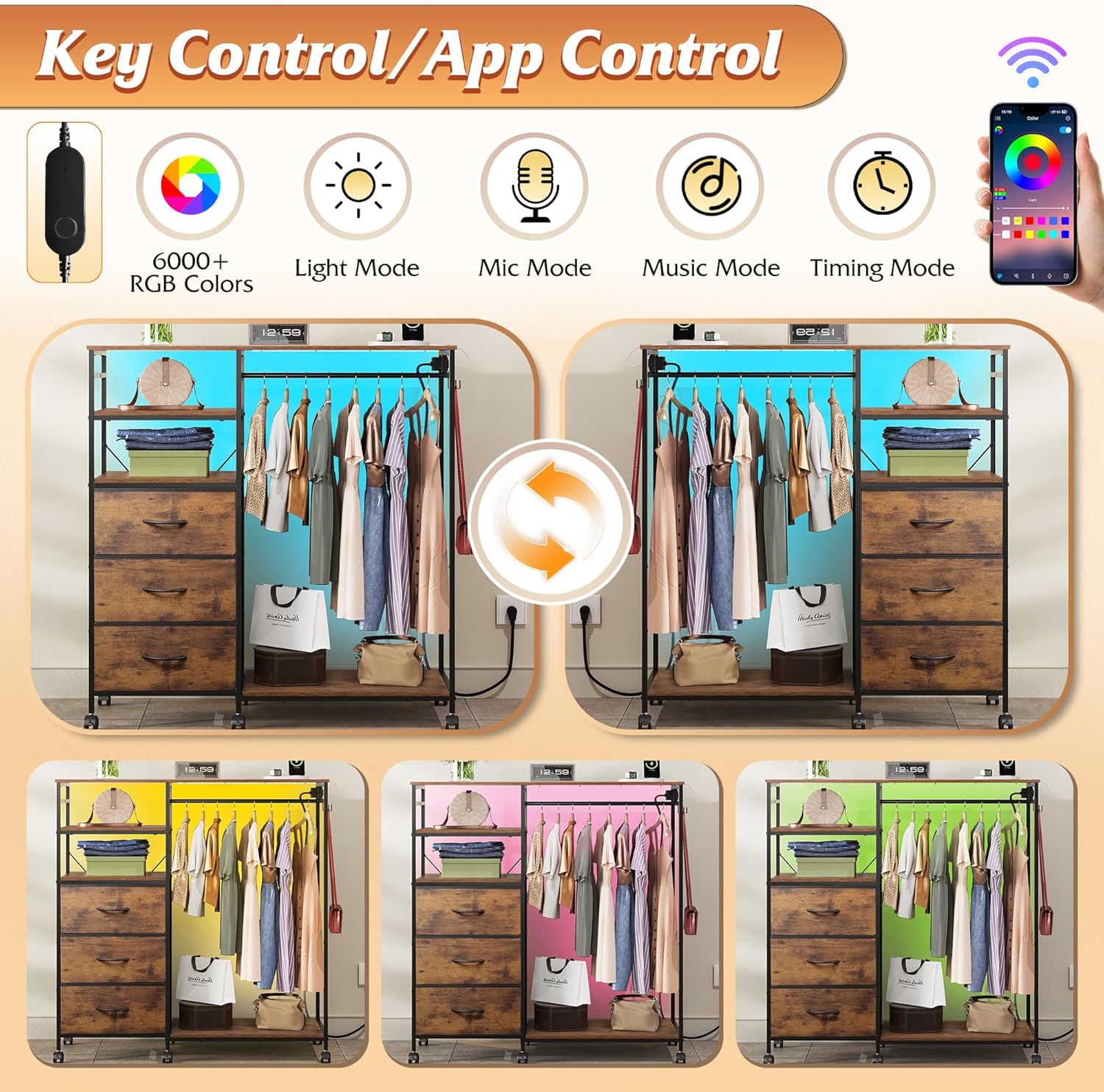 - 【🏠Charming LED Dresser with charging station】60000 color rhythm, define your space mood with one click, easily adjust the light intensity and speed level via remote control or APP. It flexibly adapts to various scenes such as living room, esports room, and the lighting can be synchronized with music to provide a personalized atmosphere for movie nights, games, and family gatherings!