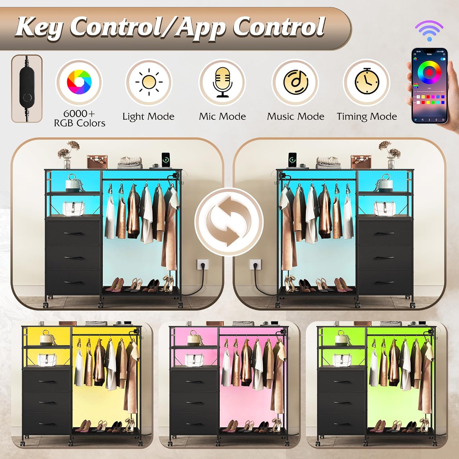 WLIVE 42''W Black Dresser for Bedroom with Hanging Rack, 3 Drawer Dresser with LED Lights & Charging Station, Fabric Dressers & Chest of Drawers, Storage Organizer with Open Shelves for Living Room