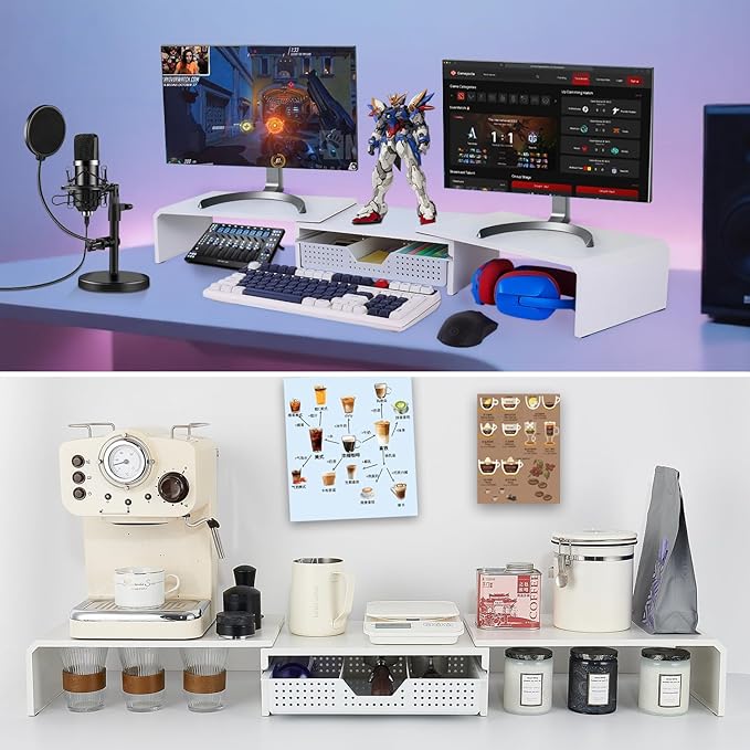 - { Versatile Uses } The dual monitor stand riser can be widely applicated, it is designed not just for desk, you can use it for coffee nook, gaming, live streaming, designing, video editing and others. The laptop stand riser can hold up coffee machine, hand drip set and game console, you can also ues it as cosmetics and perfume organization, plants and pet bowls holder, toys and amiibo display riser. You decide what they are