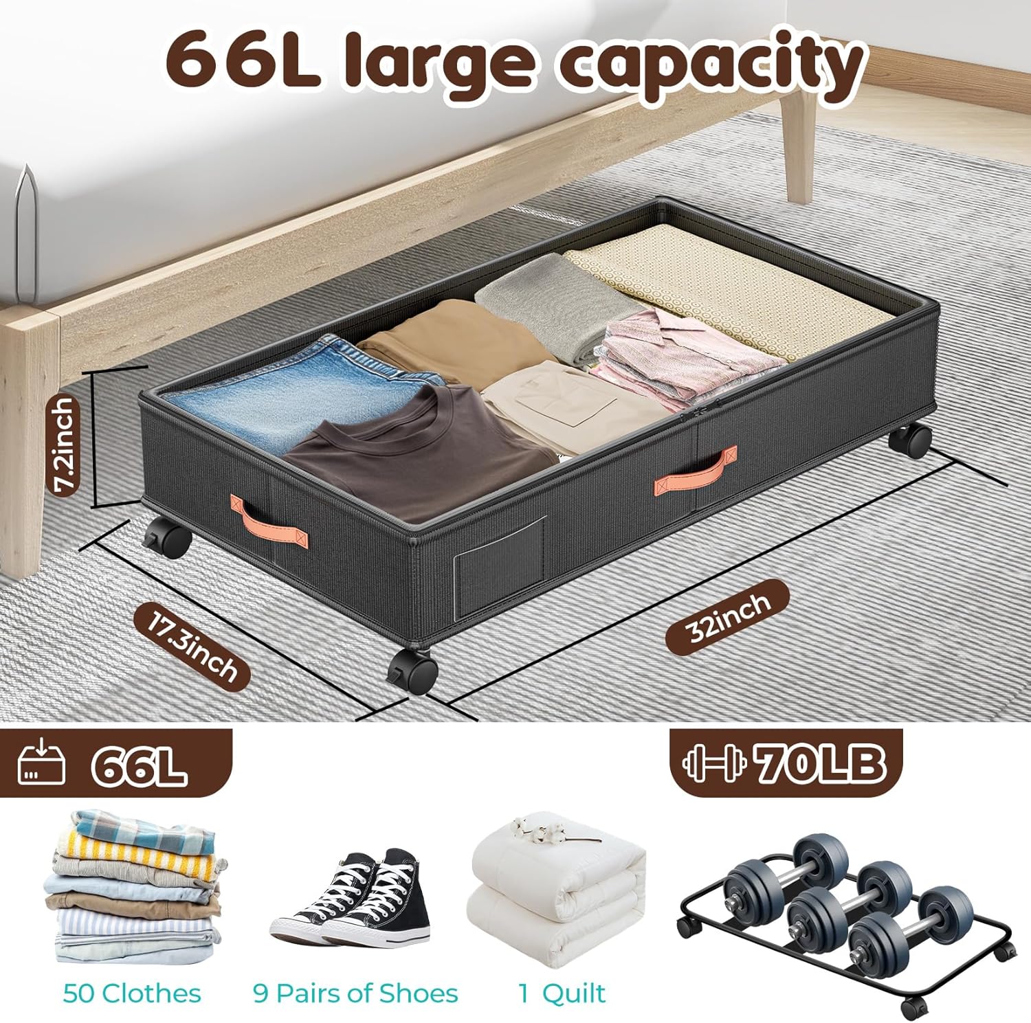 - Appeal to Practicality & Value – American-approved organization: Each under bed storage container holds 66L—ideal for bulky winter coats or summer gear. Get the set of 2 to double your space without breaking the bank. Durable, lightweight, and built to last!