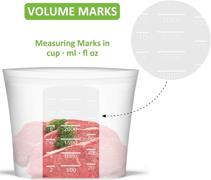 - 【LARGE-SIZE SET & ECONOMICAL】You’ll receive 4 Extra Large (4/5 gallon/ 101fl.oz/ 3000ml) and 4 Large (1/2 gallon/ 67.6fl.oz/ 2000 ml) reusable bags. The ALL large-size set perfect for bulk food, family meals and leftovers. Each bag features volume markings(cup/fl.oz/ml) for easy measurement. The translucent design helps identify contents, and each bag can replace 300+ single-use plastic bags a year, promoting a waste-free world