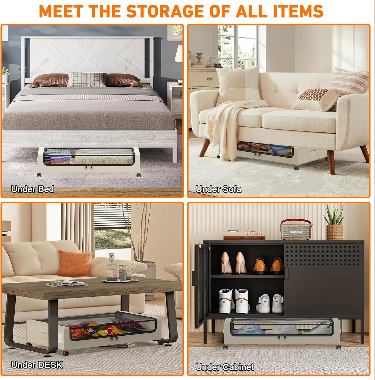 - 【Label & Clear Lid Design】Our rolling under the bed storage bins are equipped with transparent lid Windows & Label design, without having to open multiple containers or boxes, that make it easy to quickly identify the contents of your locker, Prevent items from being misstored. The bottom of the bed storage box with double zipper design and high quality material, completely keep dust, moisture and dirty things out, to ensure that your items clean and dust-free, say goodbye to clutter!