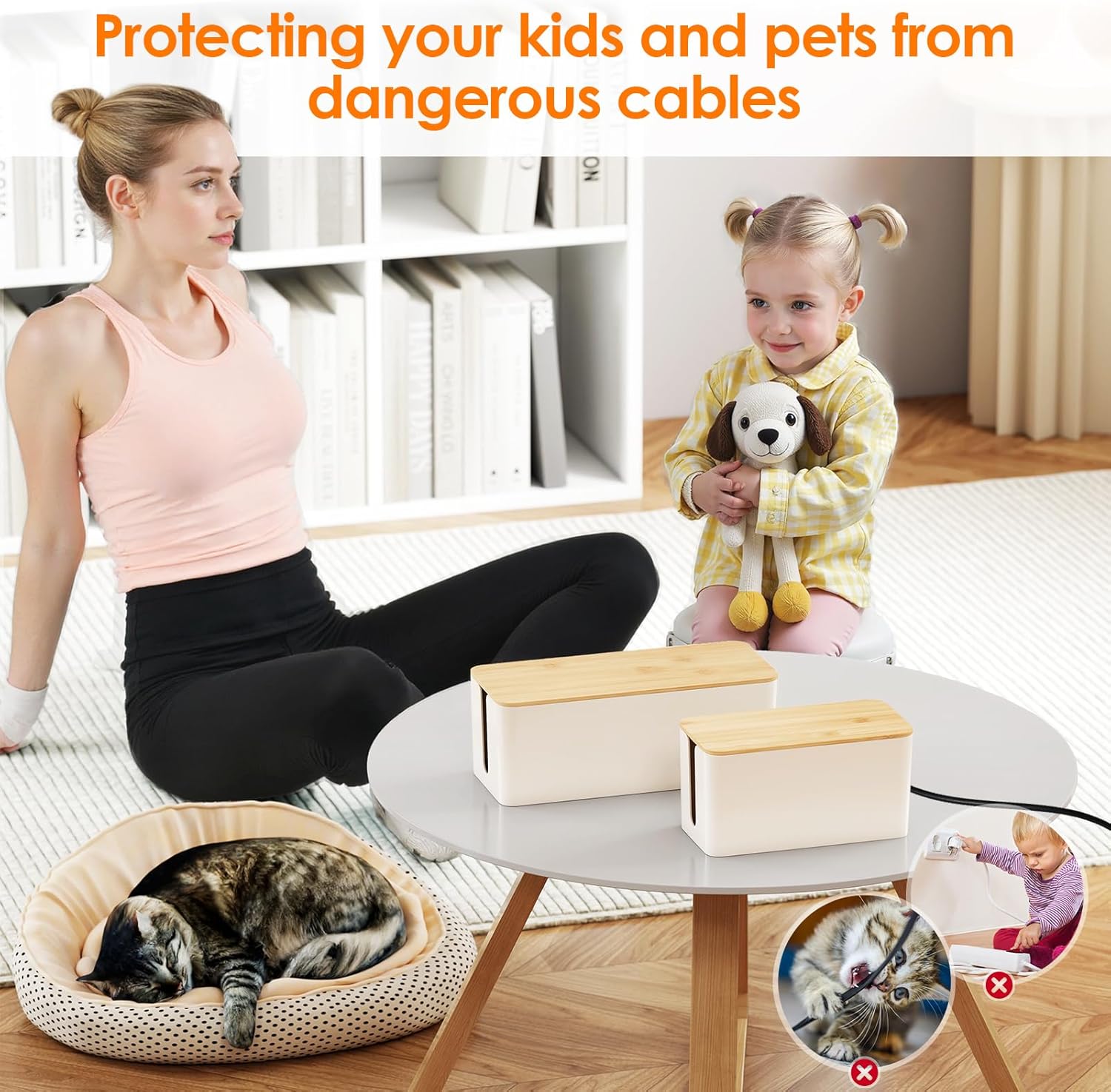 - Elegant Wood Lid and Durable ABS Base: Featuring a natural wood lid and scratch resistant plastic base, this cable management box blends with modern decor, it doubles as a phone stand while keeping cords hidden and accessible