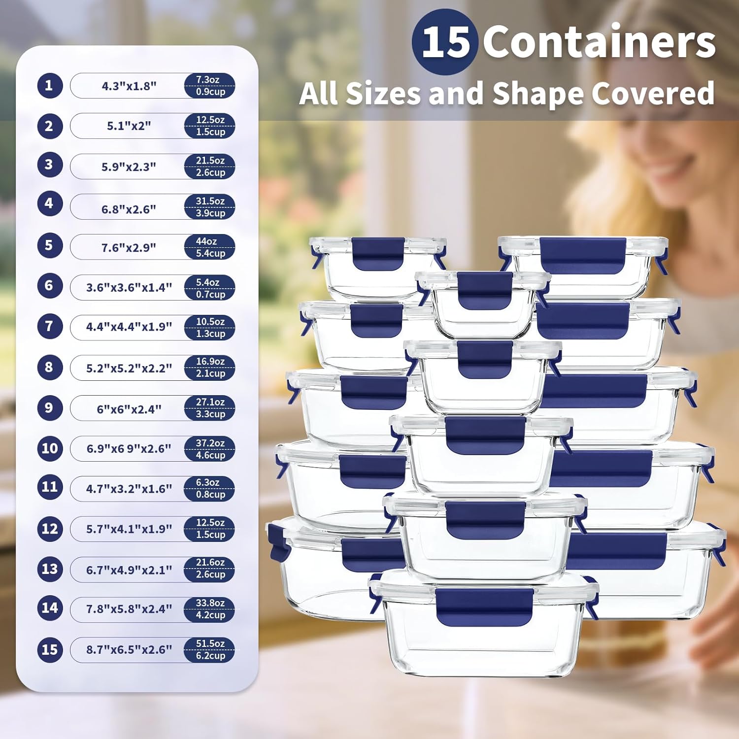 - FOOD CONTAINER SET: This set includes 15-piece glass containers and 15-piece plastic lids in multiple sizes and shapes to fulfill your food storage requirement. Capacity includes: 1(50.1oz), 1(33.8 oz), 1(21.3oz), 1(13.5oz), 1(6.3oz), 1(37.2oz), 1(27.1oz), 1(16.9oz), 1(10.5oz), 1(5.4oz), 1(44oz), 1(31.5oz), 1(21.5oz), 1(12.5oz), 1(7.3oz) container with lids. Keep your refrigerator staying organized.