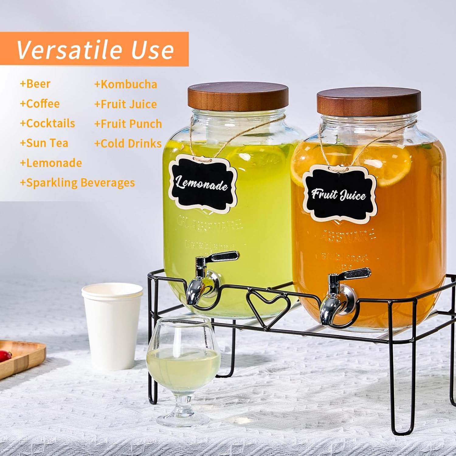 2 Pack1Gallon Glass Drink Dispensers with Stand&Bamboo Lids&Fruit Infuser,304 Stainless Steel Leak-Proof Spigot,Beverage Dispenser for Parties,Water Sangria Juice Sun Tea Lemonade(Brown)
