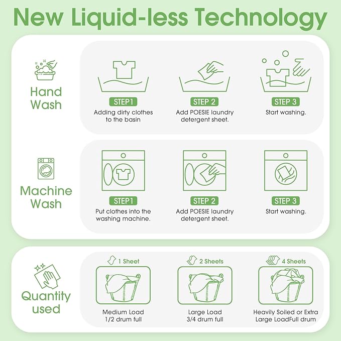 - Easy to Use - Liquidless detergent sheets, 1 sheet for small or medium loads where clothes are not very dirty, 2 sheets for large loads and 4 sheets for extra large loads, no waste. Not too little and not too much to save resources. Lighter Volume and Better Dissolving - the product is concentrated into a small piece, but has more powerful energy. And it can dissolve in water immediately, leaving your clothes fresh, clean and comfortable