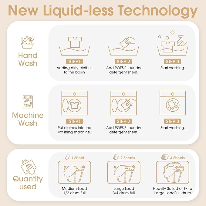 - Easy to Use - Liquidless detergent sheets, 1 sheet for small or medium loads where clothes are not very dirty, 2 sheets for large loads and 4 sheets for extra large loads, no waste. Not too little and not too much to save resources