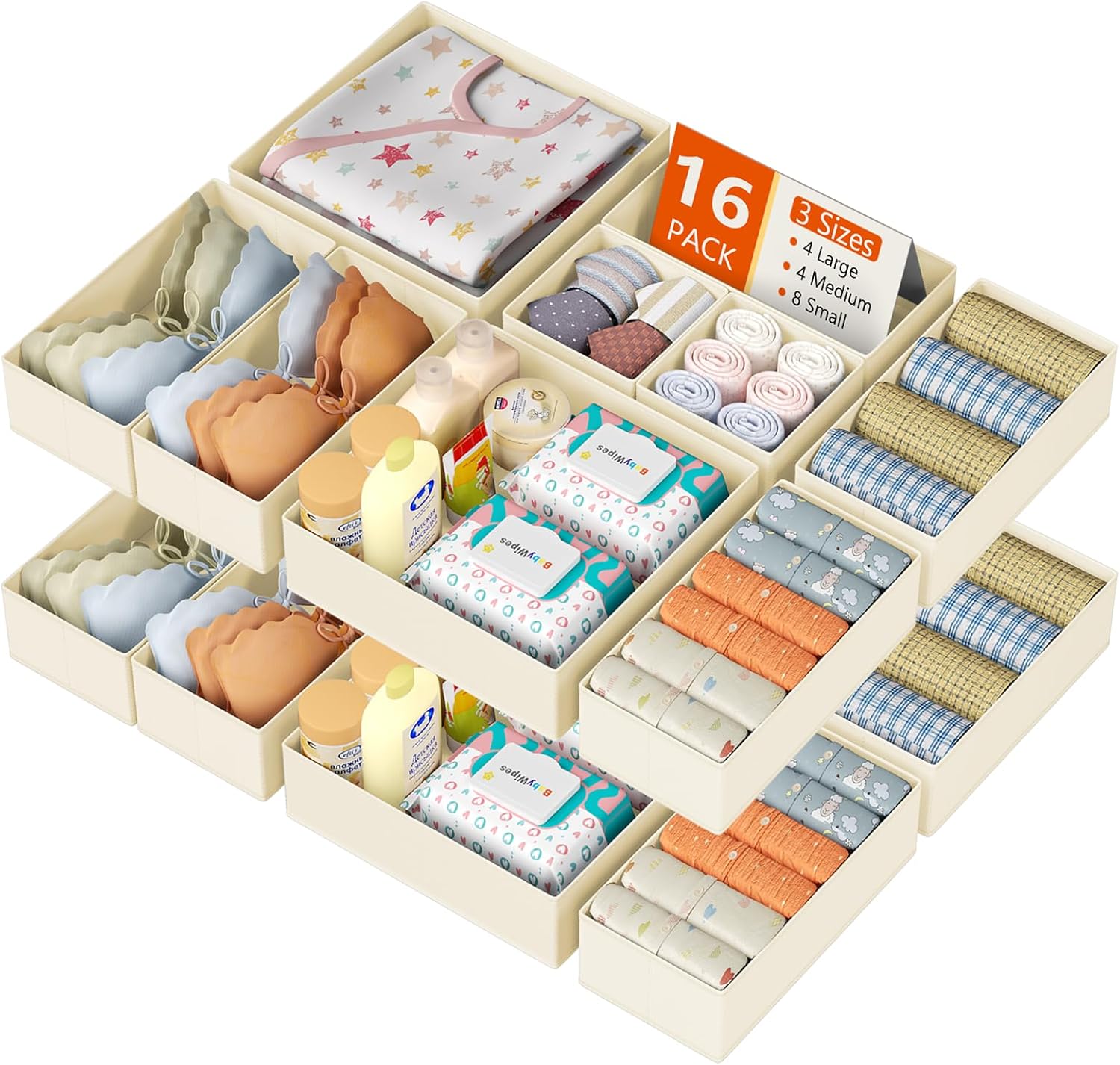 DIMJ Drawer Organizer Clothes 16 Pack - Foldable Baby Organizers and Storage & Dresser Organizer for Bedroom, Closet - Nursery Organization Dresser Dividers for underwear, Sock,Bra, Belt, Tie, Beige