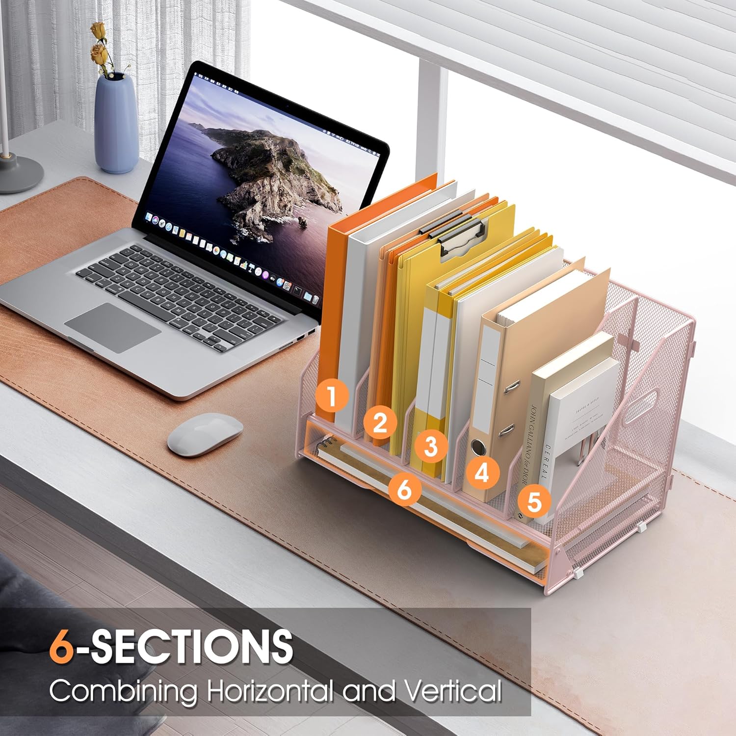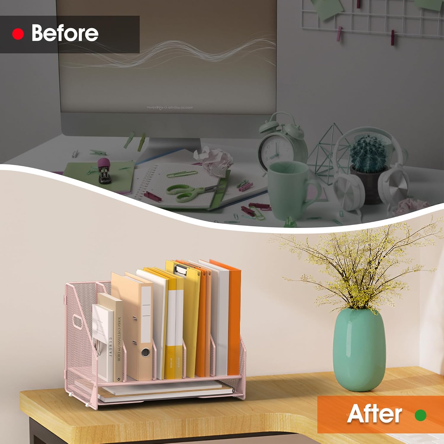 Desk File Folder Holder Organizer-5 Vertical Compartments Racks and Paper Letter Tray,Mesh Magazine File Holder Sorter,Desktop Accessories & Workspace Organizers for Home,Office,School-Pink