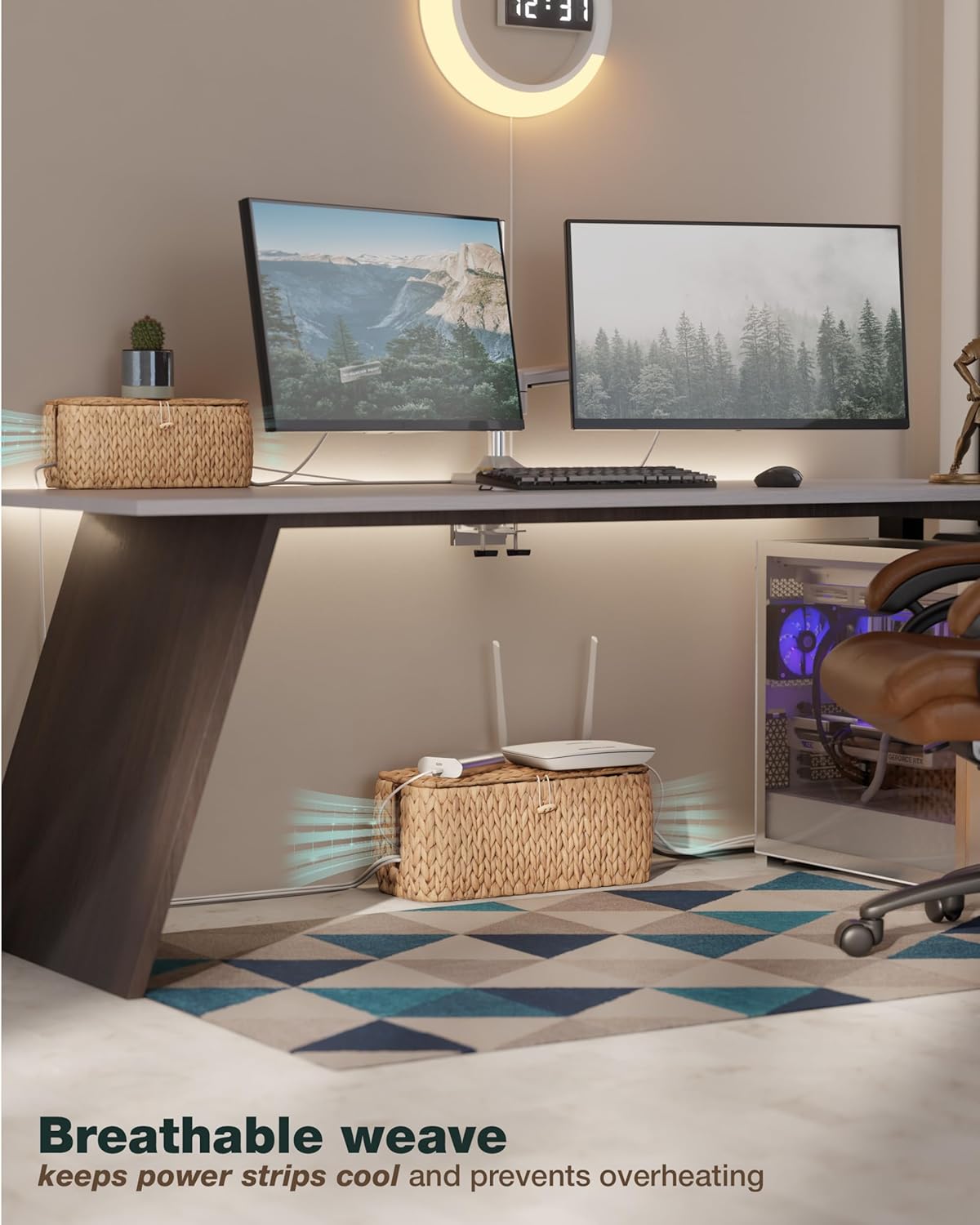 - š¬ļø Naturally Breathable Design: Handwoven with natural Cyperaceae fibers, the entire body of this cable organizer box offers excellent airflow. This naturally ventilated structure prevents overheating of power strips and chargers, ensuring safe and efficient use for your electronic devices..