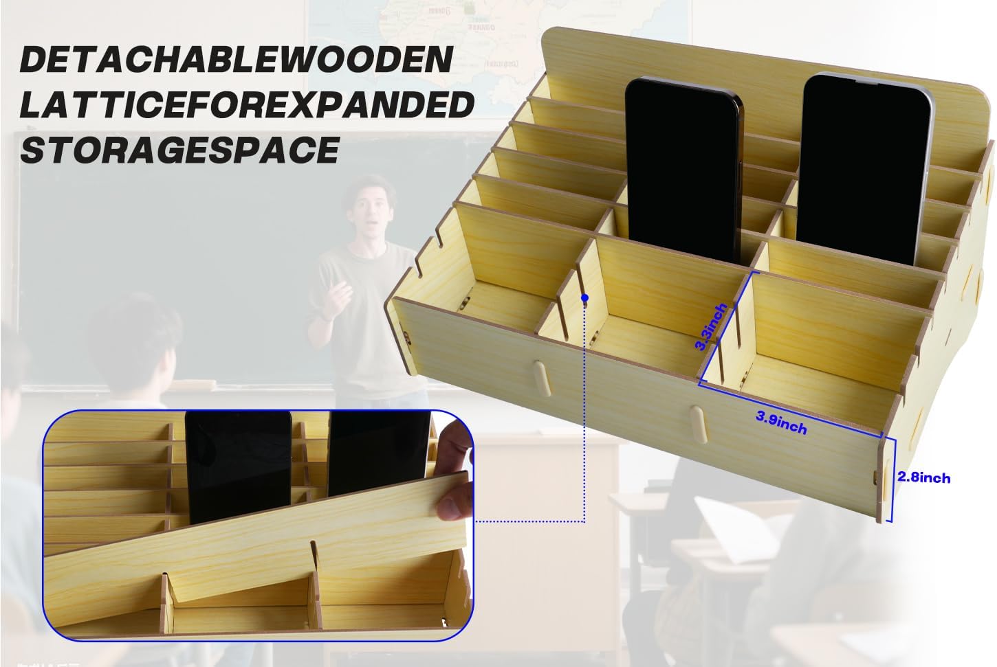 - The classroom phone holder is crafted from high-quality wood, offering sturdiness, practicality, structural stability, and long-lasting durability. The wooden desktop storage box has a capacity of 24 mobile phones, effectively meeting the needs of centralized device management in educational settings