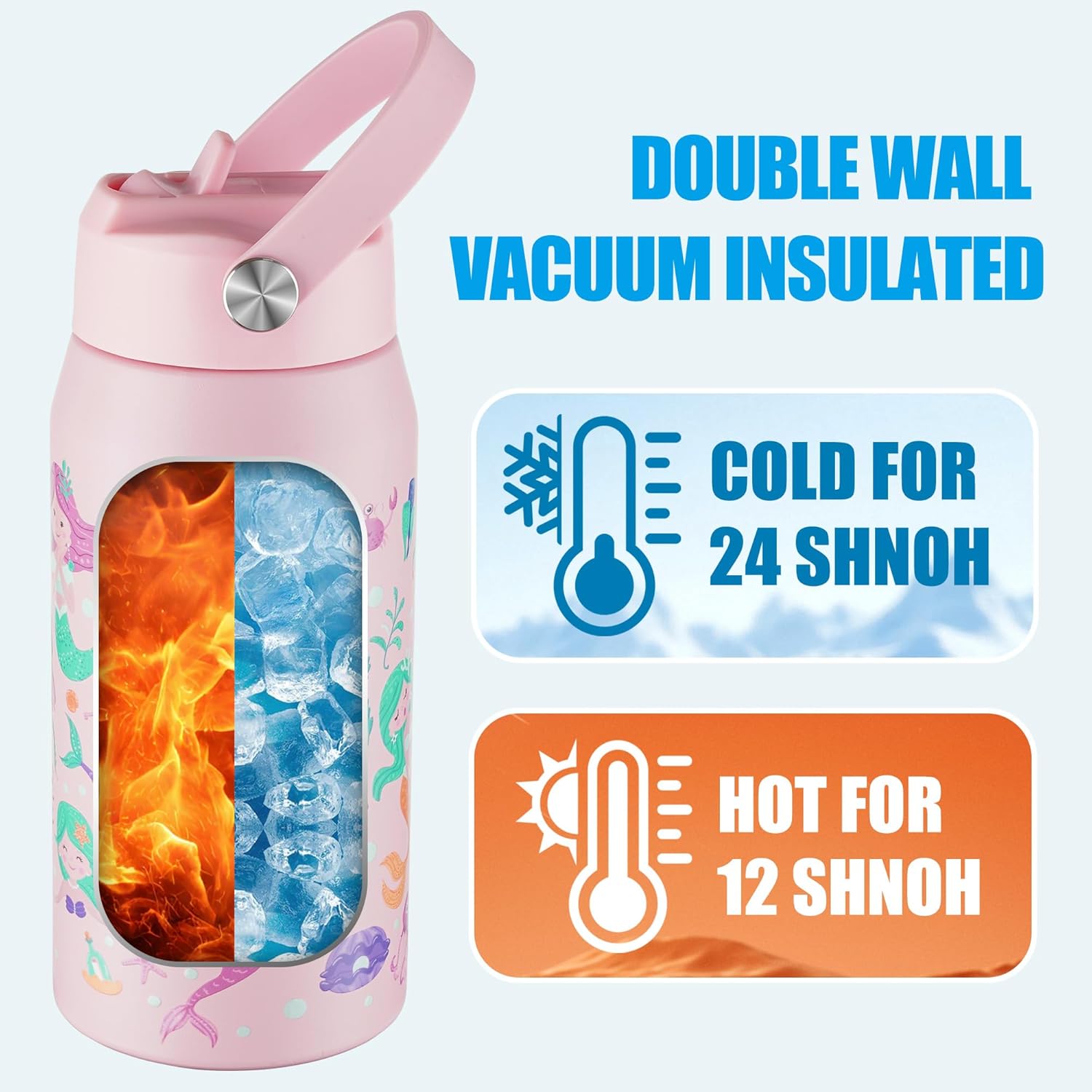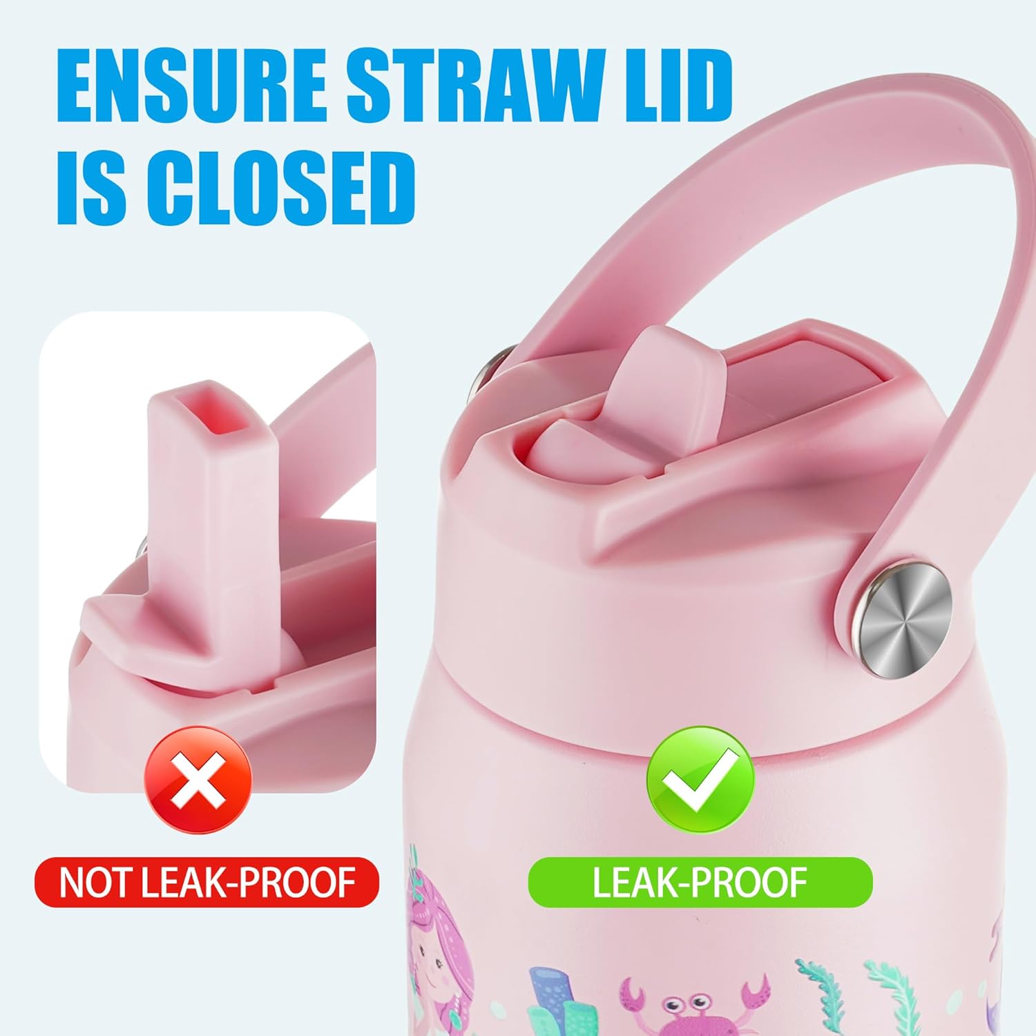 OLDLEY kids Water Bottle - 18oz Insulated Stainless Steel - Wide Straw Lid, Non Spill, Leakproof, Kids Water Bottle for School,Mermaid