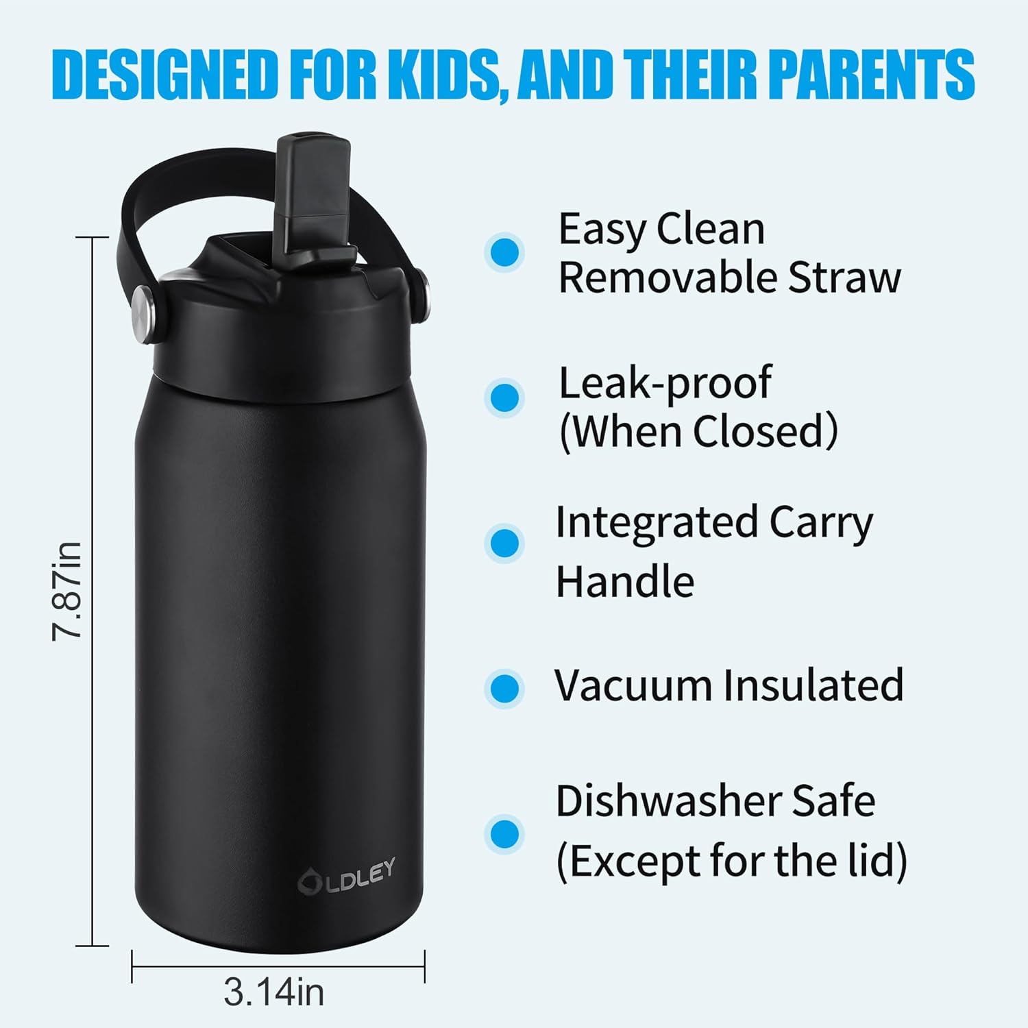 OLDLEY kids Water Bottle - 18oz Insulated Stainless Steel - Wide Straw Lid, Non Spill, Leakproof, Kids Water Bottle for School,Black