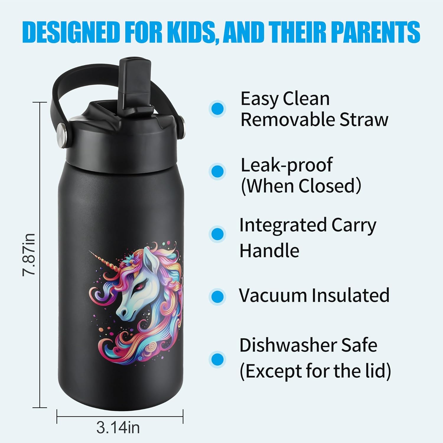 OLDLEY kids Water Bottle - 18oz Insulated Stainless Steel - Wide Straw Lid, Non Spill, Leakproof, Kids Water Bottle for School,Black Unicorn