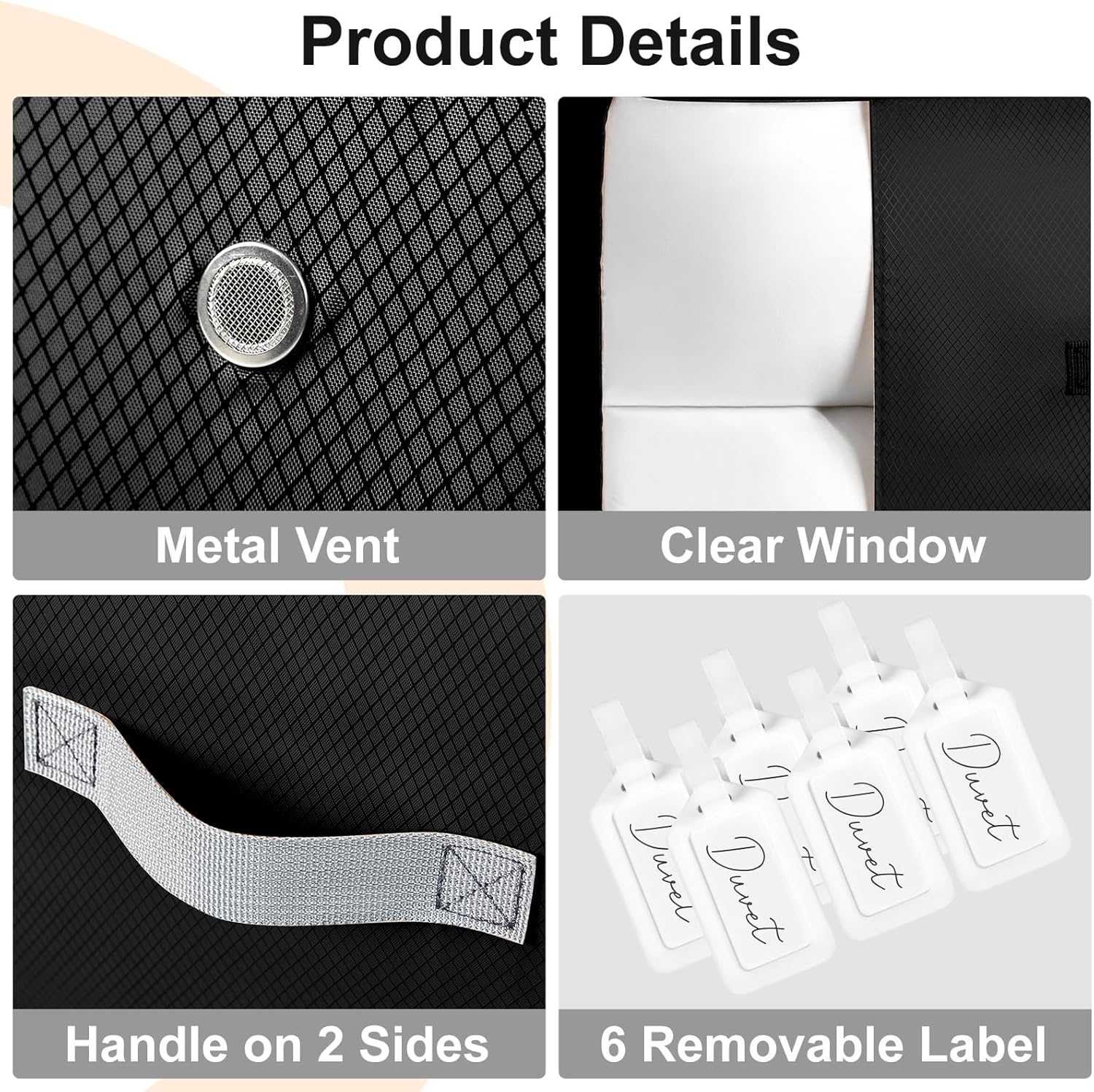 - [Transparent Window and Customizable Labels] Keep your storage organized and easily accessible with our transparent window and movable label system. Whether you’re storing blankets, bedding, down coat or seasonal items, you can quickly identify and retrieve your stored items without needing to open the storage bag, making organization seamless