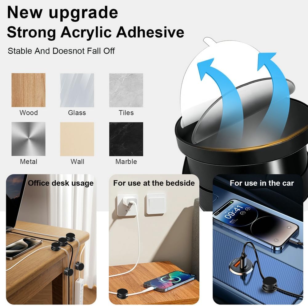 - 360° Swivel Design for Tangle-Free Cords Our cable clips feature a smooth 360° rotatable base, allowing effortless adjustment of cable angles to prevent tangling or strain. Perfect for nightstands, desks, or car dashboards, the swivel design keeps cords neatly positioned from any direction, ensuring a clutter-free setup for charging or workspaces.