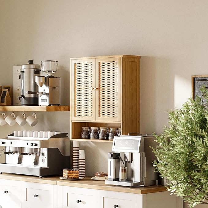 - STABLE & DURABLE - This double door bathroom wall cabinet combines sturdy bamboo and premium MDF construction for exceptional load-bearing capacity without being easily deformed. Featuring an eco-friendly paint finish, breathable rattan door, convenient handle, and reinforced metal wall anchor on the back, it delivers both safety and elegant home decor solutions