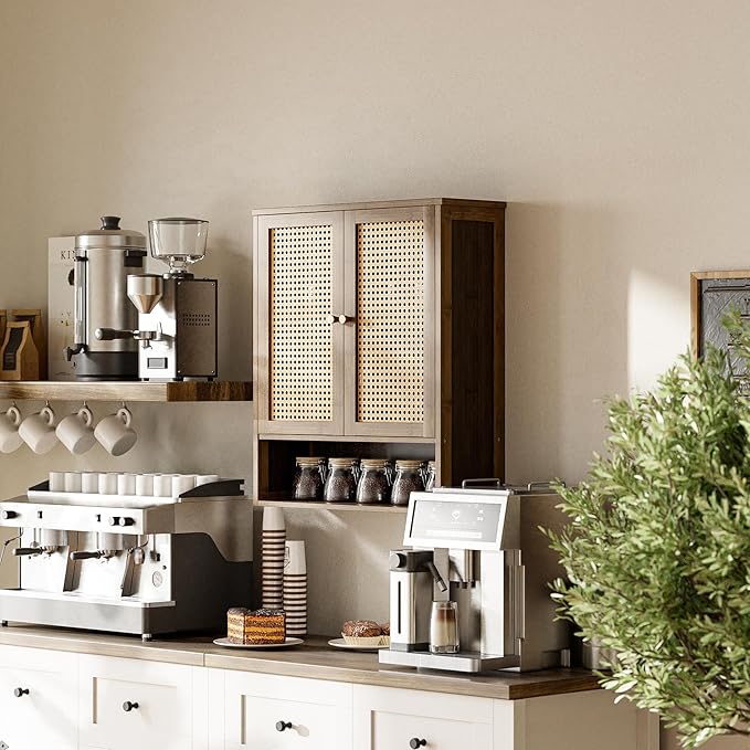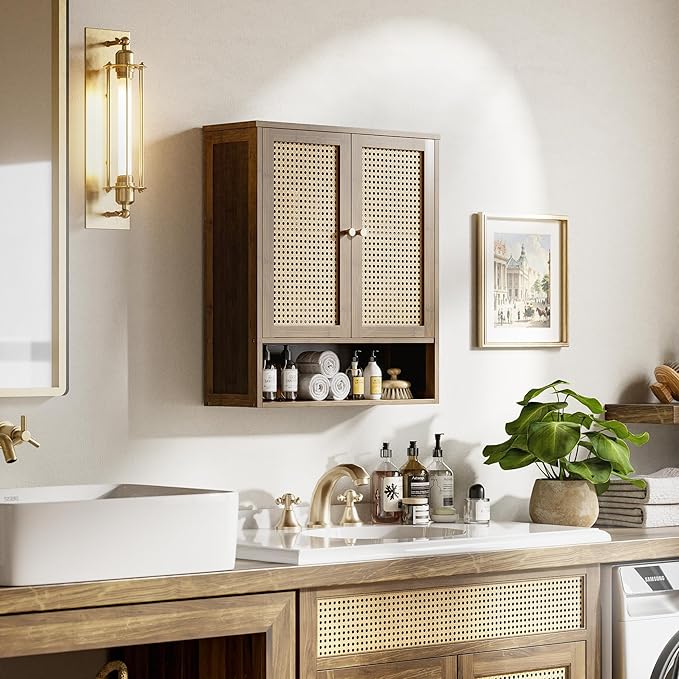 - STABLE & DURABLE - This double door bathroom wall cabinet combines sturdy bamboo and premium MDF construction for exceptional load-bearing capacity without being easily deformed. Featuring an eco-friendly paint finish, breathable rattan door, convenient handle, and reinforced metal wall anchor on the back, it delivers both safety and elegant home decor solutions
