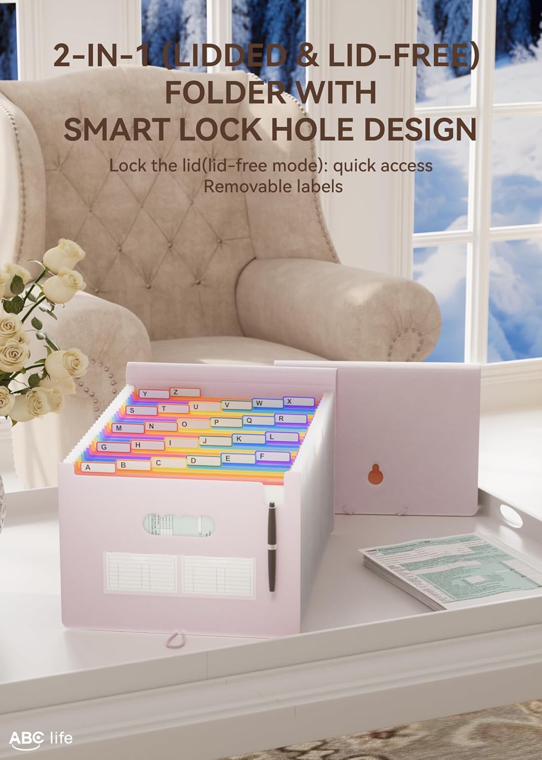 ABC life 26 Pockets Accordion File Organizer, Expanding File Folder, Portable Monthly Paper Bill Tax Receipt Organizer, Letter A4 Size Document Organizer with Blank Labels - Pinkish Purple