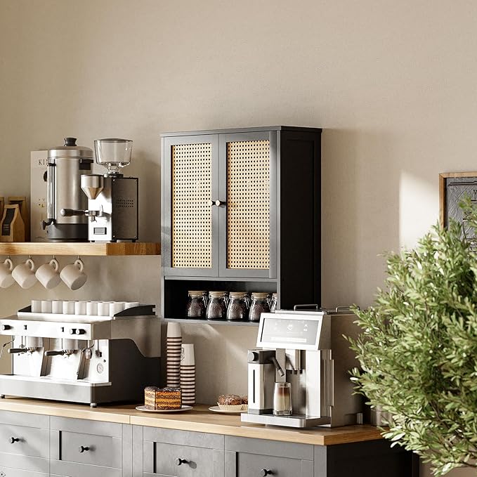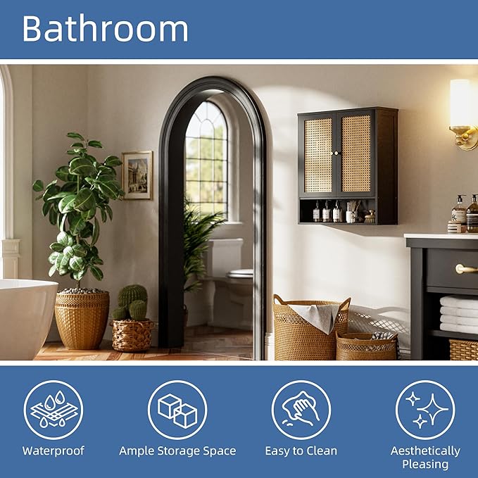 - STABLE & DURABLE - This double door bathroom wall cabinet combines sturdy bamboo and premium MDF construction for exceptional load-bearing capacity without being easily deformed. Featuring an eco-friendly paint finish, breathable rattan door, convenient handle, and reinforced metal wall anchor on the back, it delivers both safety and elegant home decor solutions