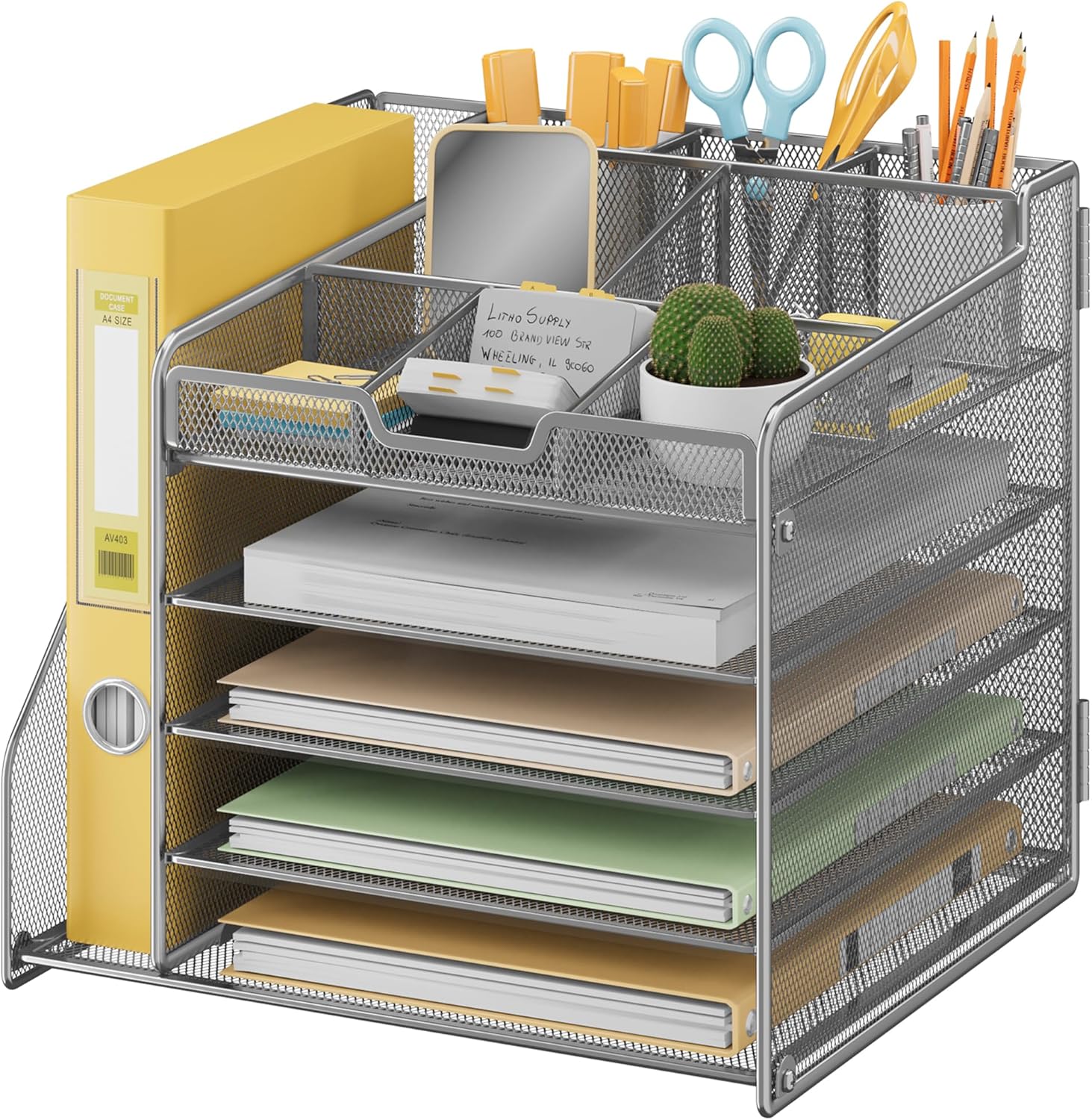 Lavatino 5-Tier Metal Mesh Desk Organizer with File Holder & 7 Customizable Compartments | Paper Letter Tray for Office or Home Desk Storage | Keep Workspace Supplies Neat & Organized, Silver