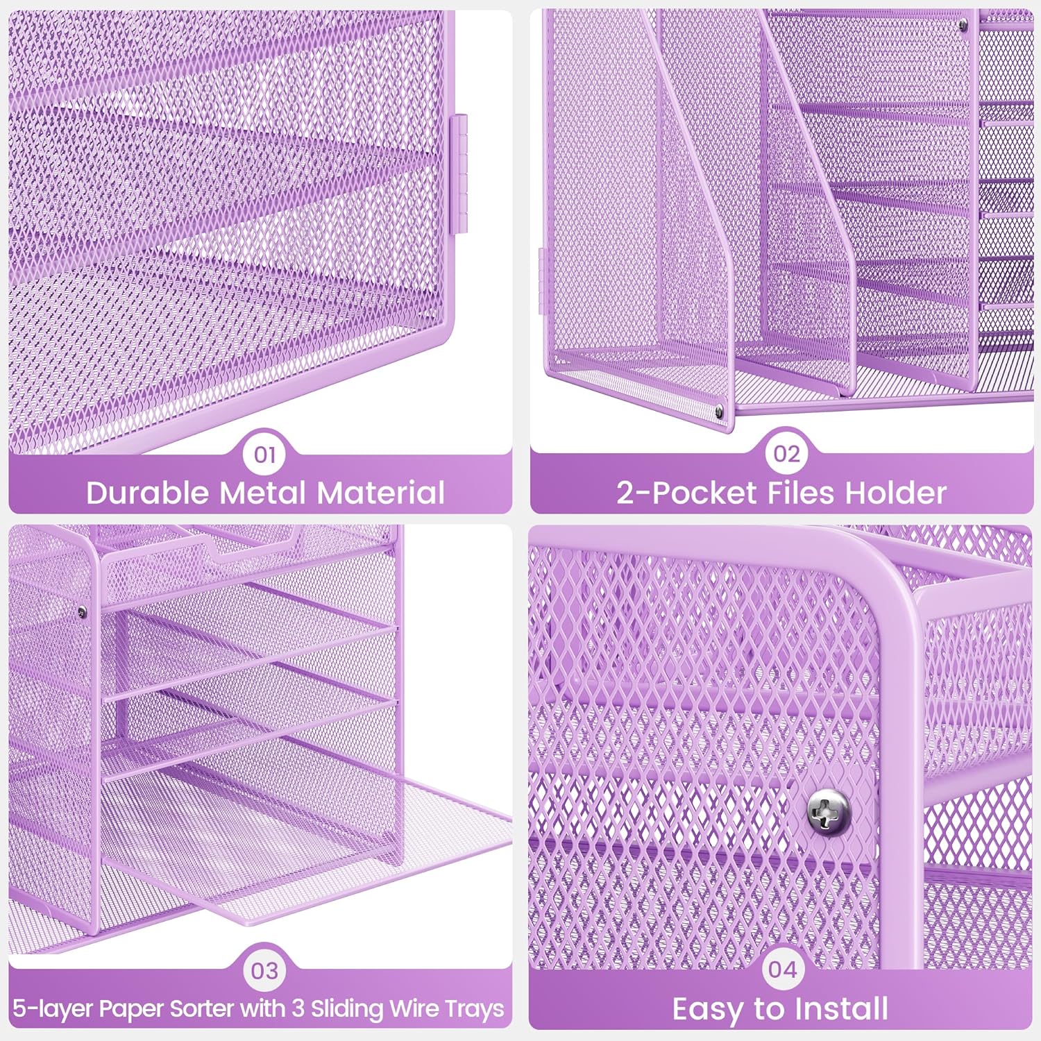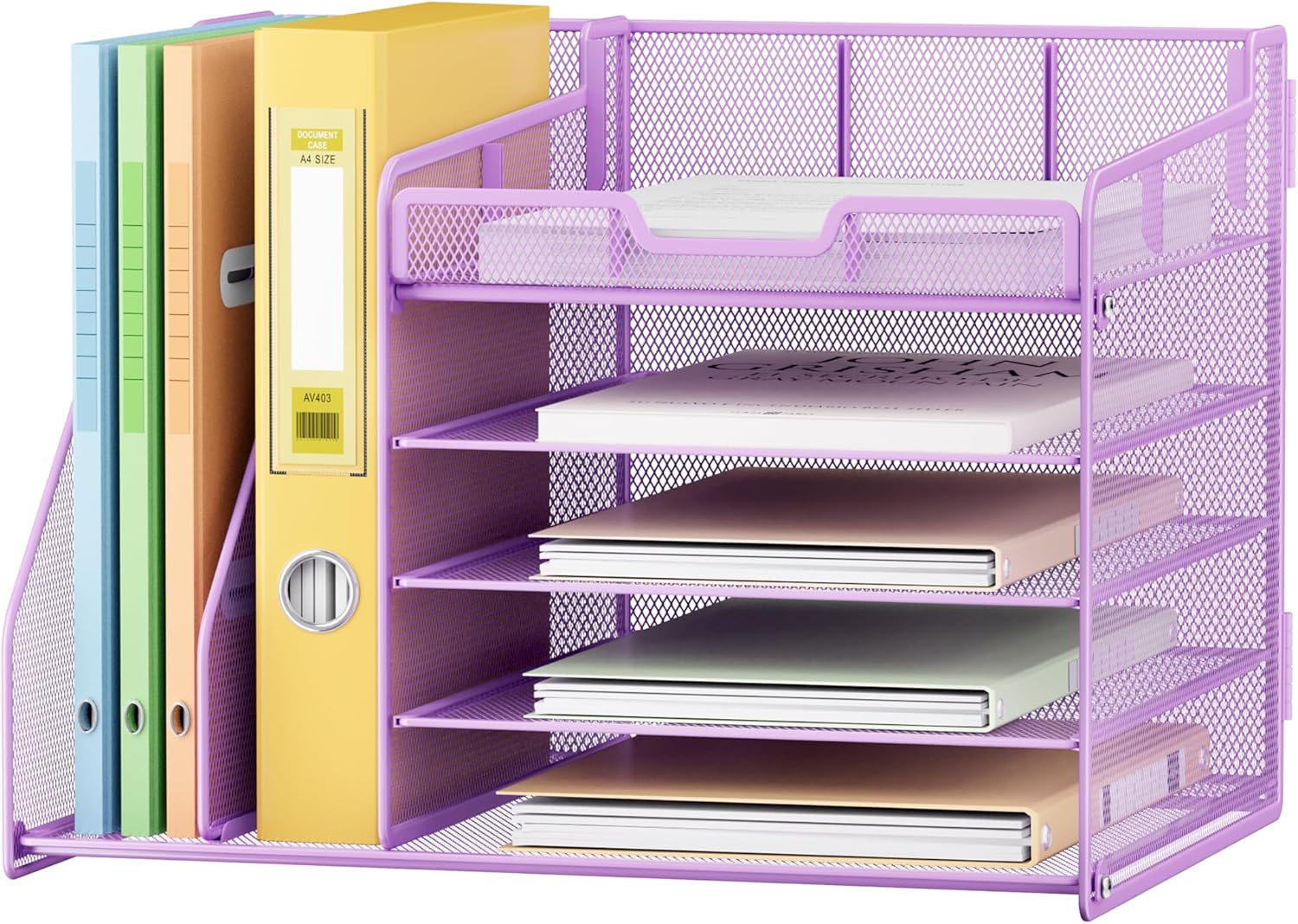 Lavatino 5-Tier Desk Organizer with 2 File Holders, Metal Adjustable Paper Letter Tray for Office or Home Desk Organizers and Accessories | 7 Flexible Dividers Keep Workspace Supplies Neat, Purple