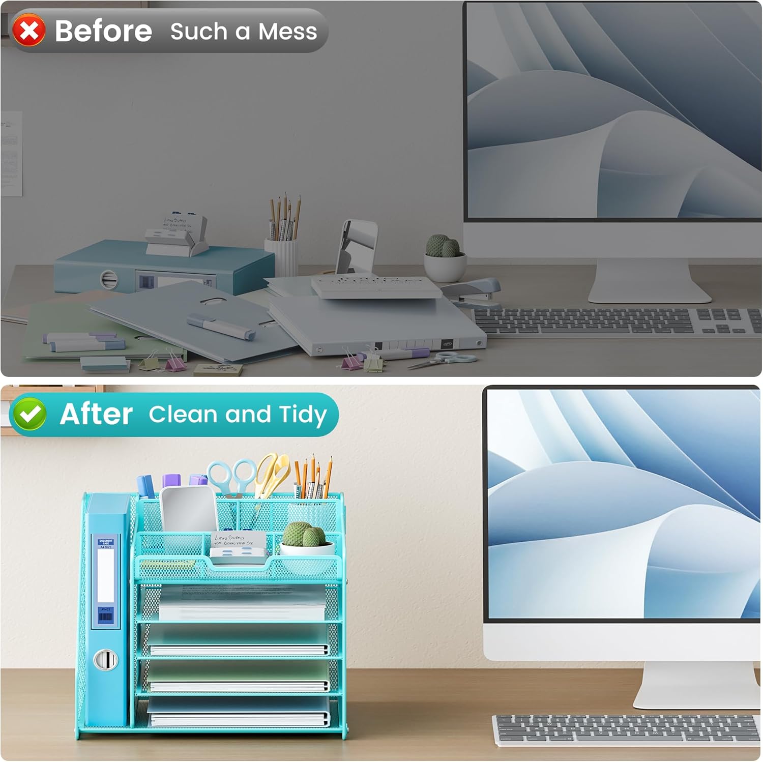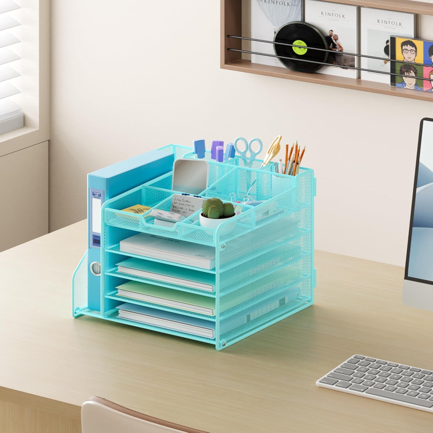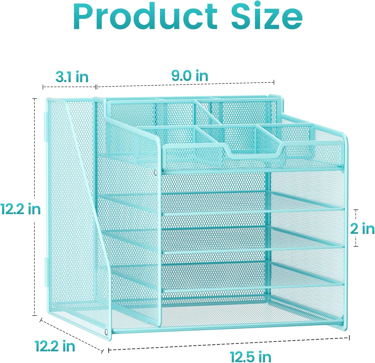Lavatino 5-Tier Metal Mesh Desk Organizer with File Holder & 7 Customizable Compartments | Paper Letter Tray for Office or Home Desk Storage | Keep Workspace Supplies Neat & Organized, Blue