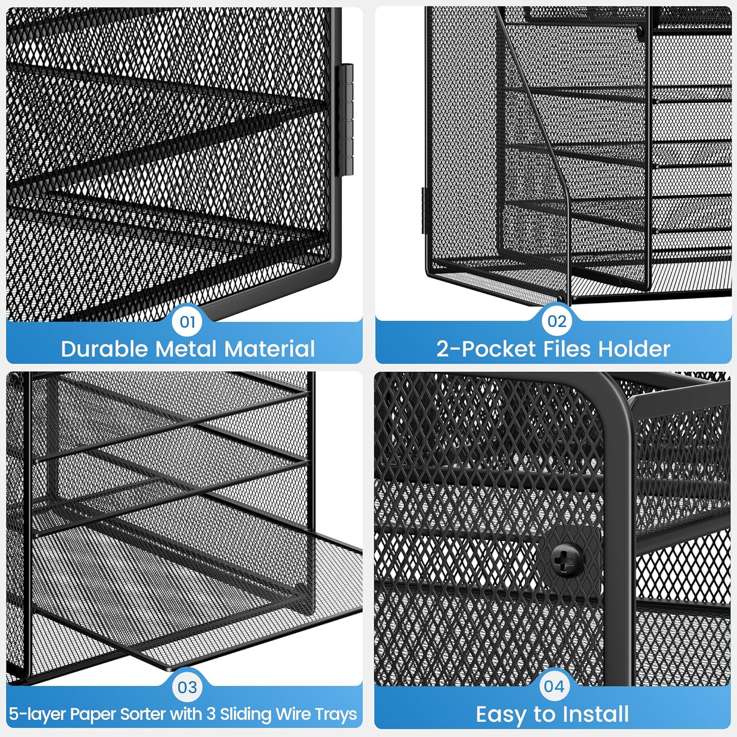 Lavatino Desk Organizer, 5-Tier Metal Mesh Paper Letter Tray with 1 File Holders & 7 Flexible Dividers for Office or Home Desk Organizers and Accessories, Keep Workspace Supplies Neat, Black