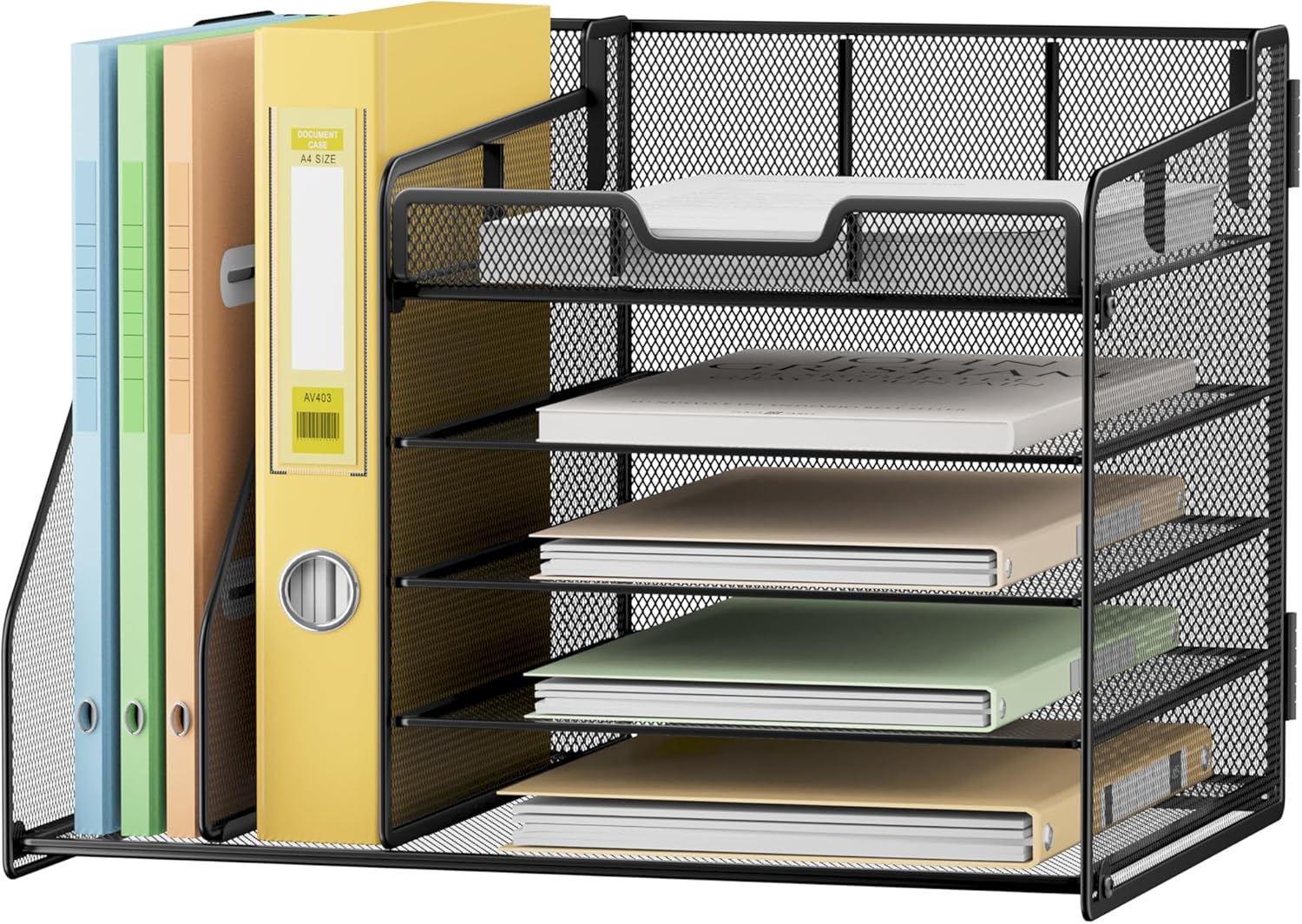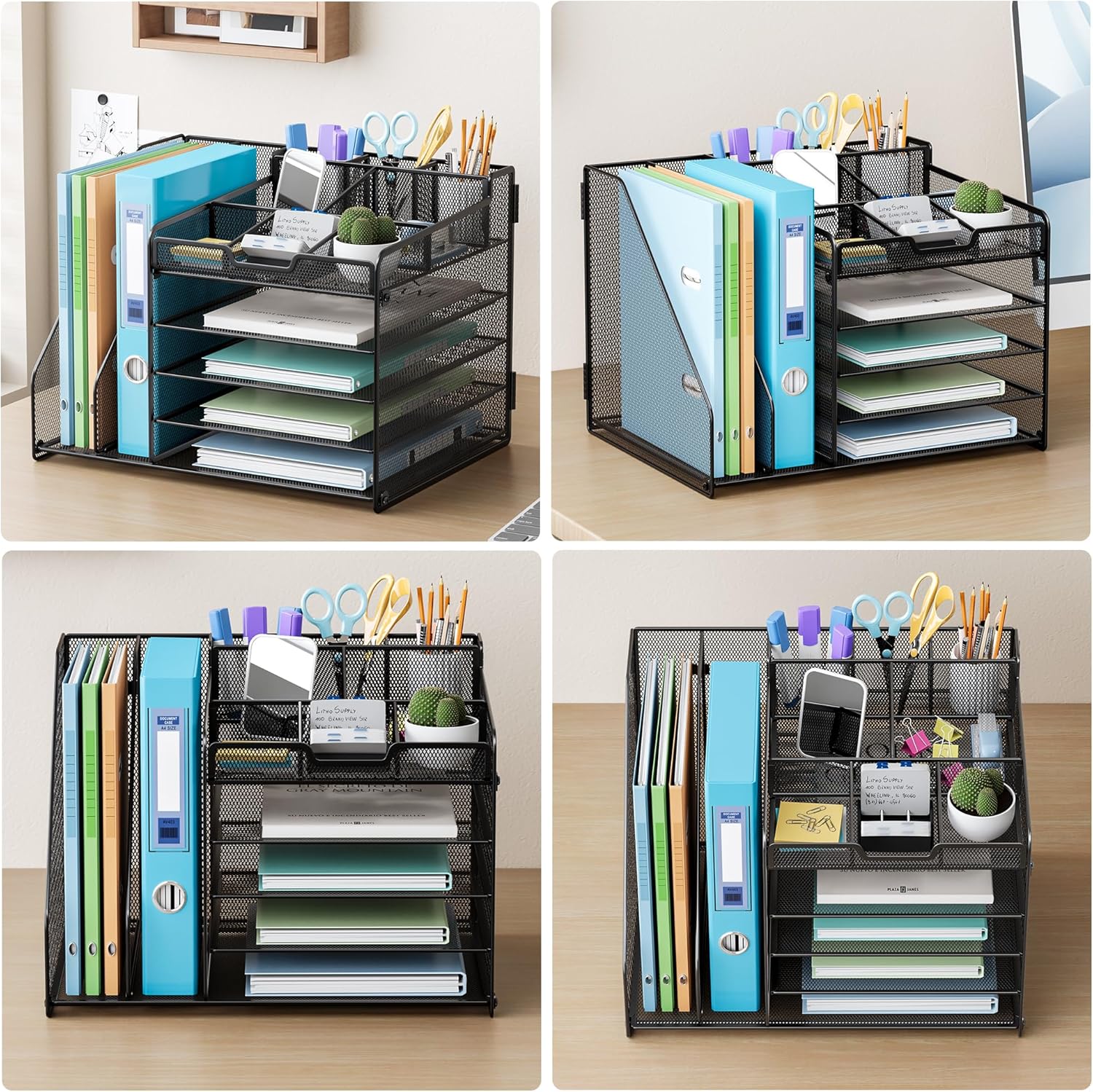 Lavatino Desk Organizer, 5-Tier Metal Mesh Paper Letter Tray with 2 File Holders & 7 Flexible Dividers for Office or Home Desk Organizers and Accessories, Keep Workspace Supplies Neat, Black
