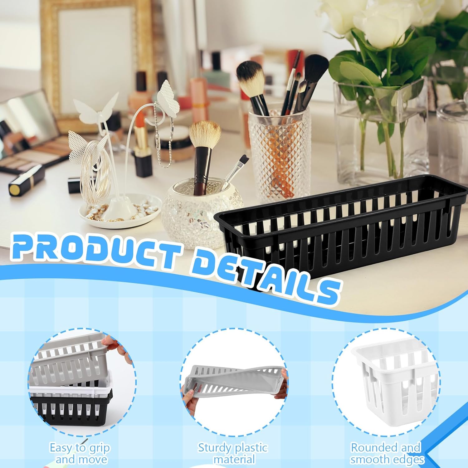 6 Pcs Black,White,Gray Slim Plastic Storage Baskets Tray 10 x 3 x 2.5 Inch Compact Stackable Desk Organizer for Office, Classroom, School Supplies, and Home Storage, Organization(Black,White,Gray)