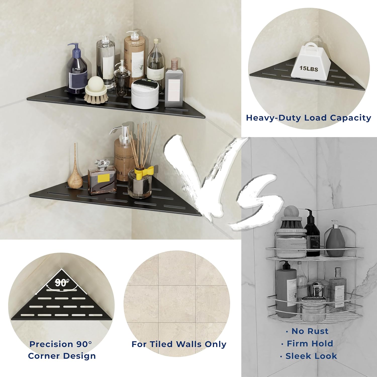 - Heavy-duty 0.12" thick 304 stainless steel construction supports full-size bottles without bending or rusting—ideal for built-in shower shelves and corner shower caddies used in humid bathrooms