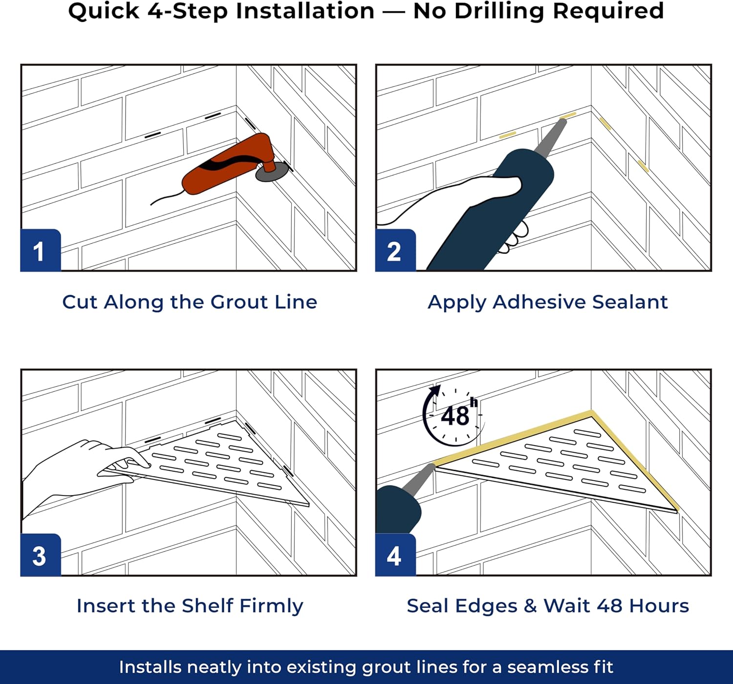- Designed for recessed tiled corners, the shower shelf installs securely with no drilling or adhesive required—perfect for permanent bathroom storage and modern shower organization