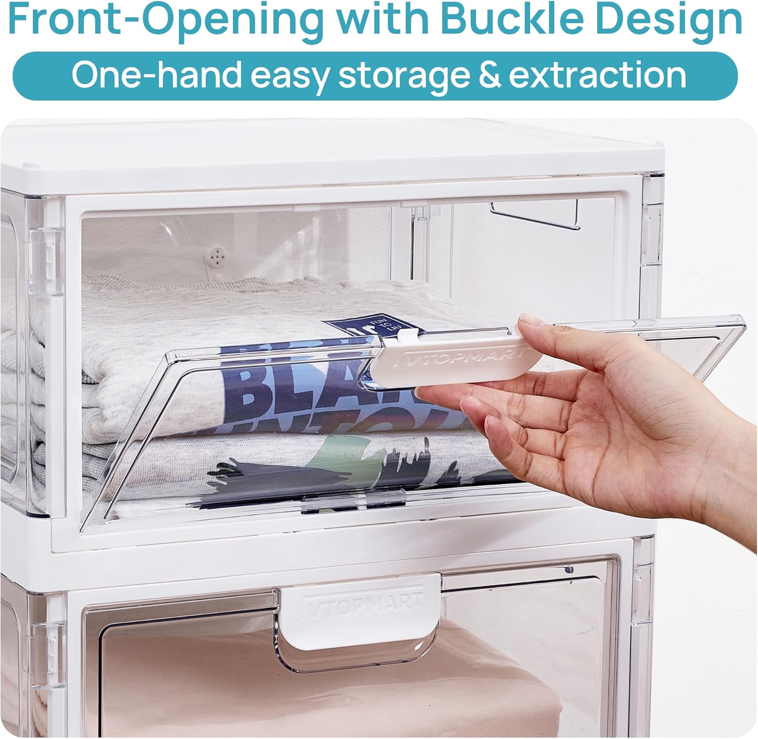 - 【Front-Opening with Secure Buckle Design】This plastic closet storage bins with lids allows you to store and retrieve clothes easily with just one hand during your weekly tidying—no more struggling to move heavy bins. The secure buckle closure prevents accidental opening under pressure, keeping your clothes securely in place.