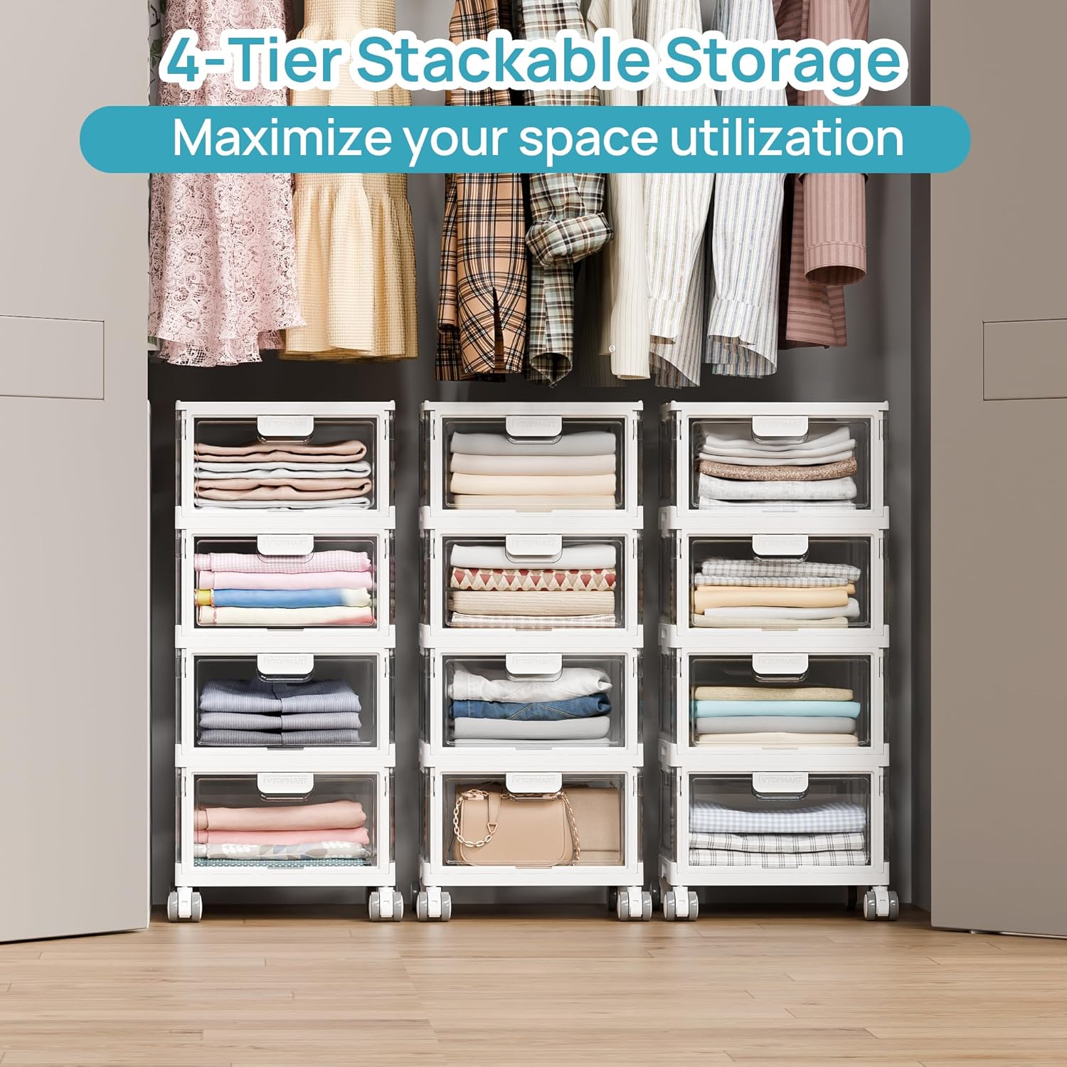 - 【Stackable Design With Wheels】 These 4-tier stackable storage bins function as a versatile storage cart, making them ideal for organizing toys, craft supplies, game accessories, and more. The side buckles ensure a secure lock while the wheels make relocation effortless.