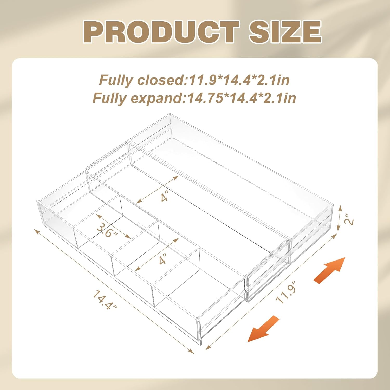 - Flexible Expansion: our expandable desk drawer organizer, the length of the side is about 14.4 inches, and the bottom compartment length adjusts from 11.9 inch to 15.75 inch; This expandability can meet customized needs and ensure efficient use of your drawer space