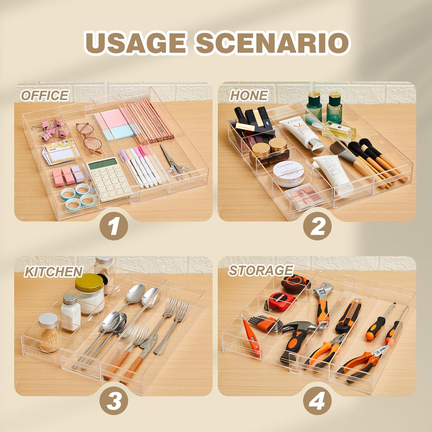 - Diverse Functionality: our clear desk drawer organizer is versatile, ideal for office or kitchen supplies, small desktop items, cosmetics, jewelry, tableware, silverware, and even bathroom supplies; It can be your good solution for diverse storage needs