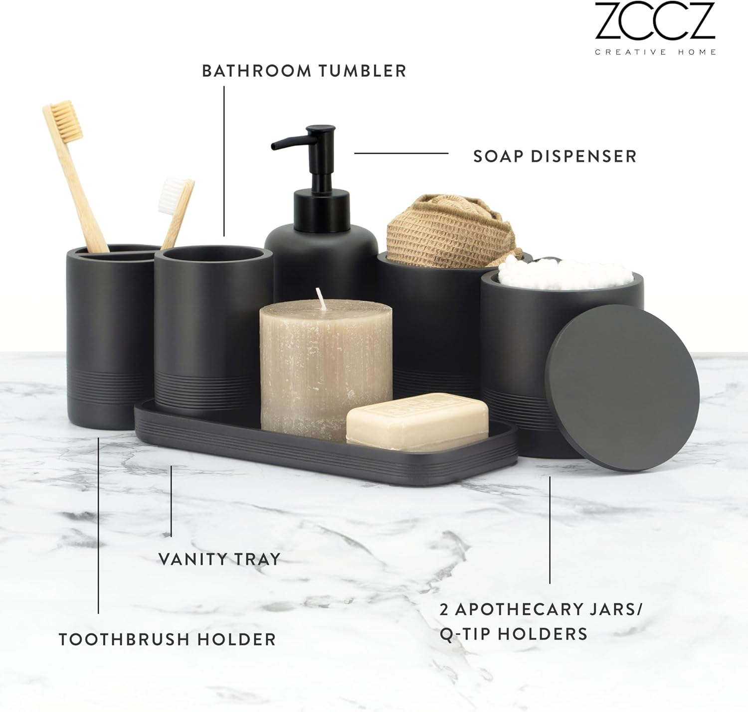 ZCCZ Black Matte Bathroom Accessories Set 6 Pieces - Toothbrush Holder, Lotion Dispenser, Qtip Container, Vanity Tray, Tumbler - Countertop Organizer for Bathrooms - Elegant and Functional Décor Set