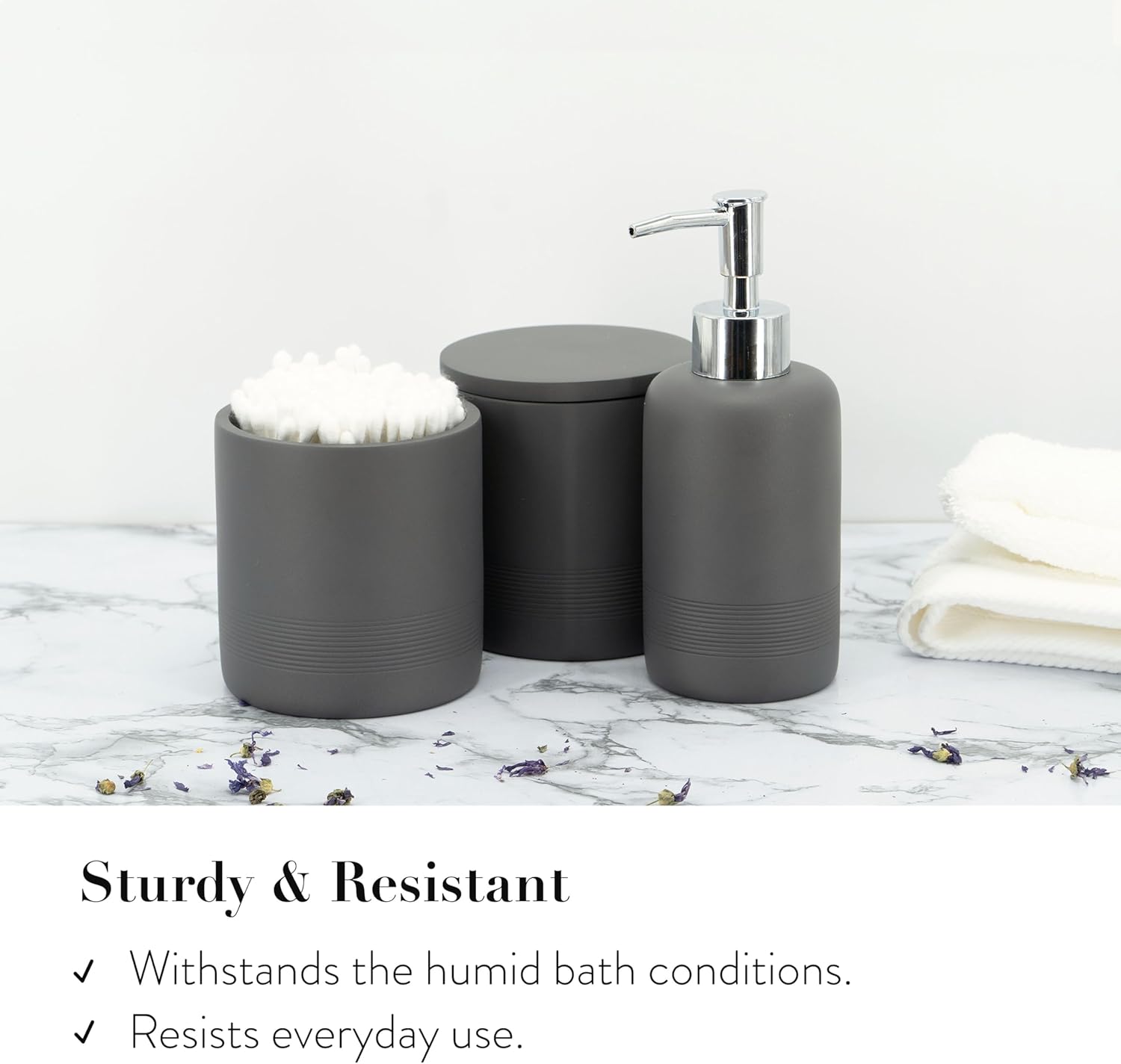 - 6 Piece Bathroom Accessory Set: Item includes 1 x soap dispenser, 1 x toothbrush holder, 1 x vanity tray, 1 x bathroom tumbler, and 2 x apothecary jars. Has most things you need for a bathroom. Made out of premium polyresin with unique stone textured shell, the bathroom accessories set made your bathroom stand out more