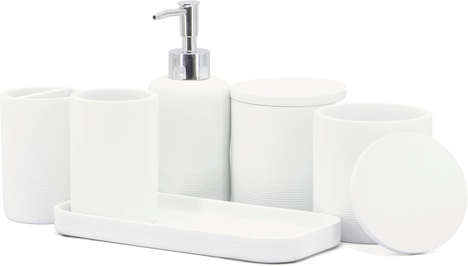 - 6 Piece Bathroom Accessory Set: Item includes 1 x soap dispenser, 1 x toothbrush holder, 1 x vanity tray, 1 x bathroom tumbler, and 2 x apothecary jars. Has most things you need for a bathroom. Made out of premium polyresin with unique stone textured shell, the bathroom accessories set made your bathroom stand out more