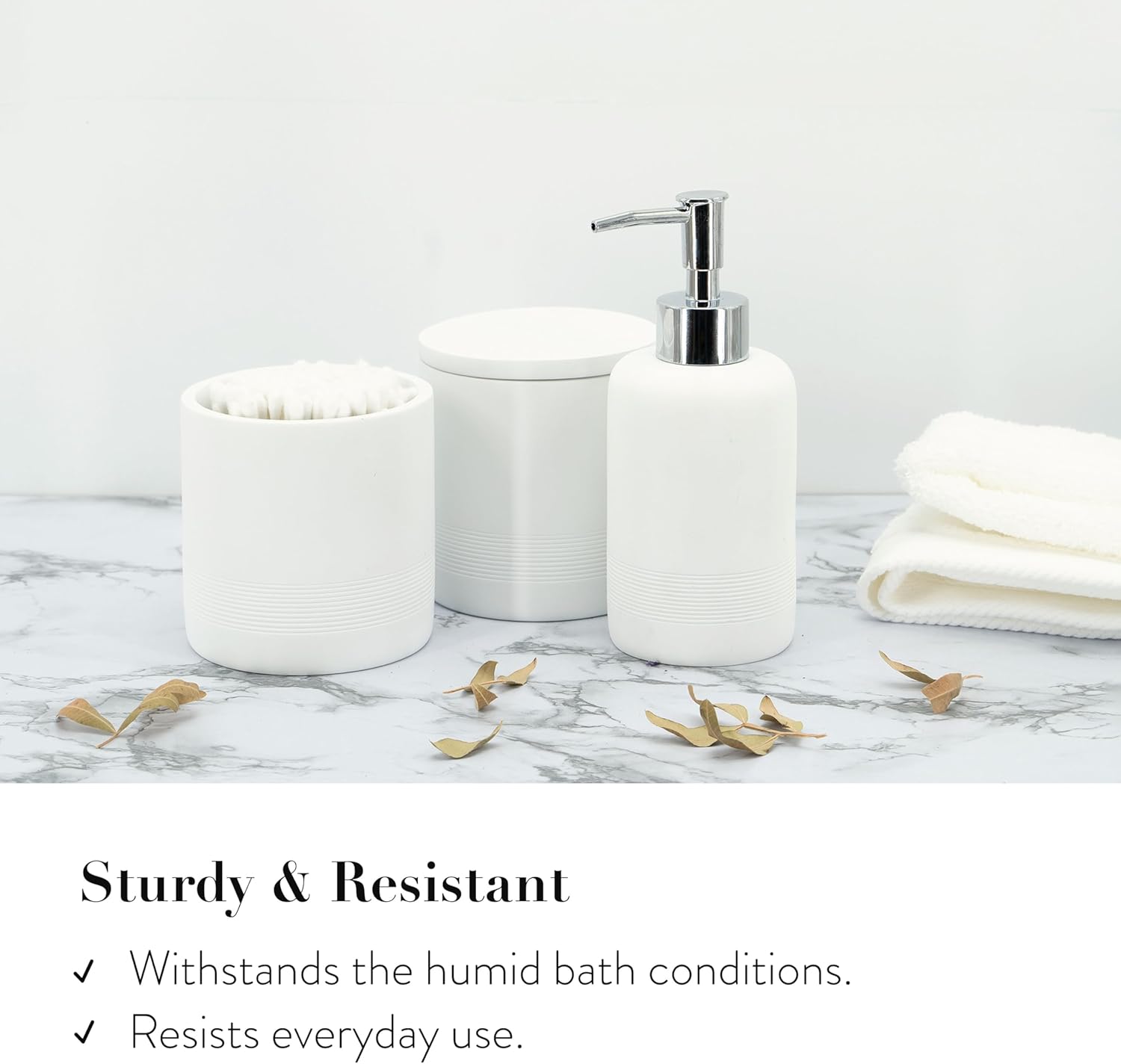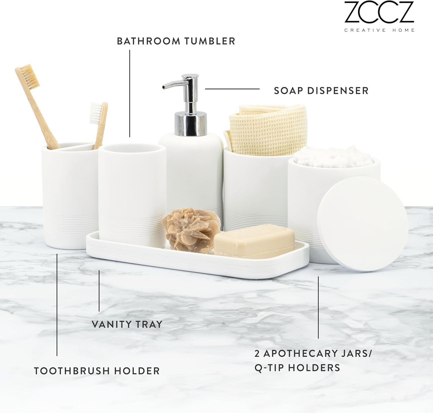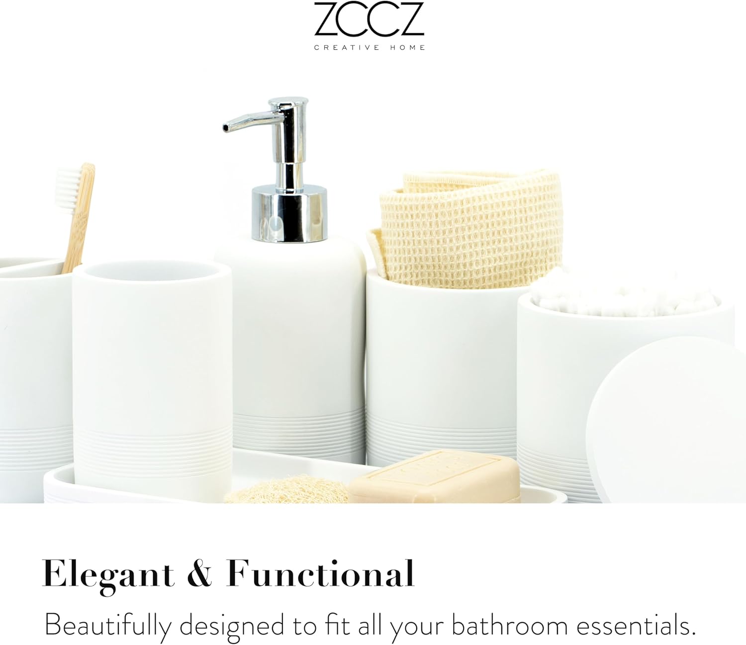 ZCCZ White Bathroom Accessories Set 6 Pieces - Toothbrush Holder, Lotion Dispenser, Qtip Container, Vanity Tray, Tumbler - Countertop Organizer for Bathrooms - Elegant and Functional Décor Set